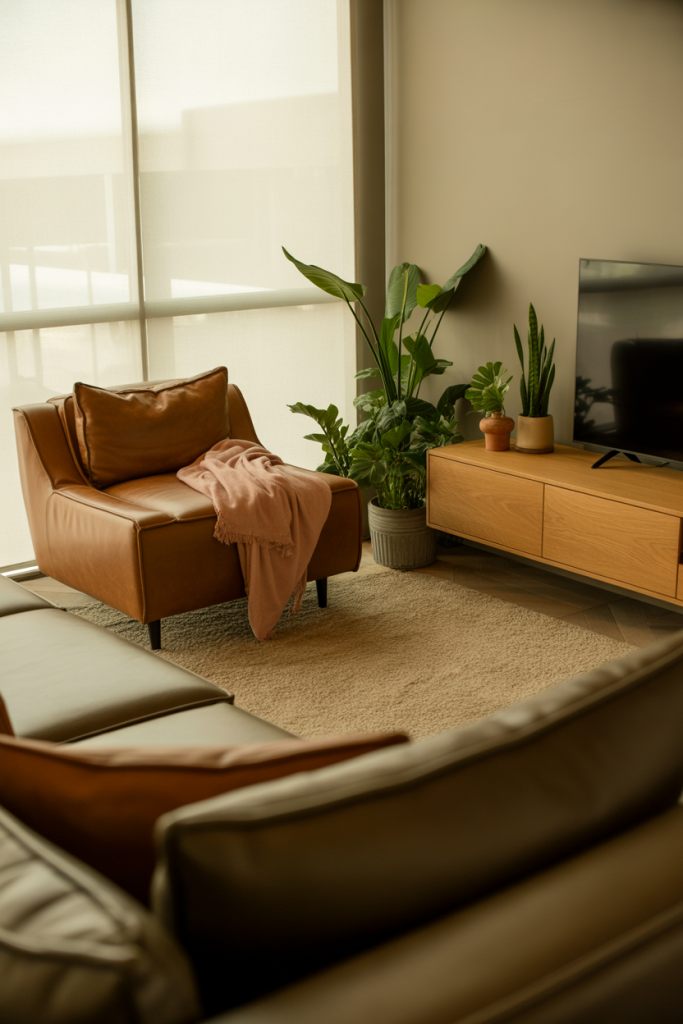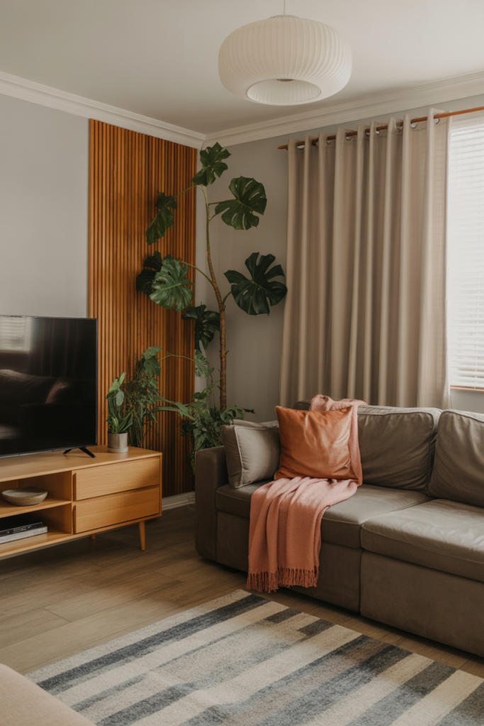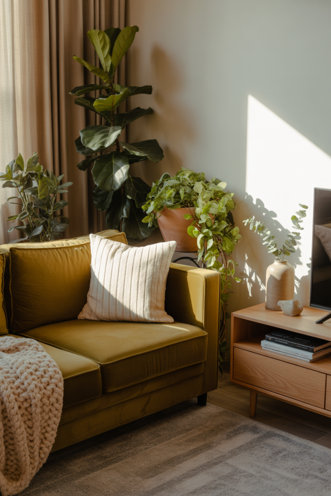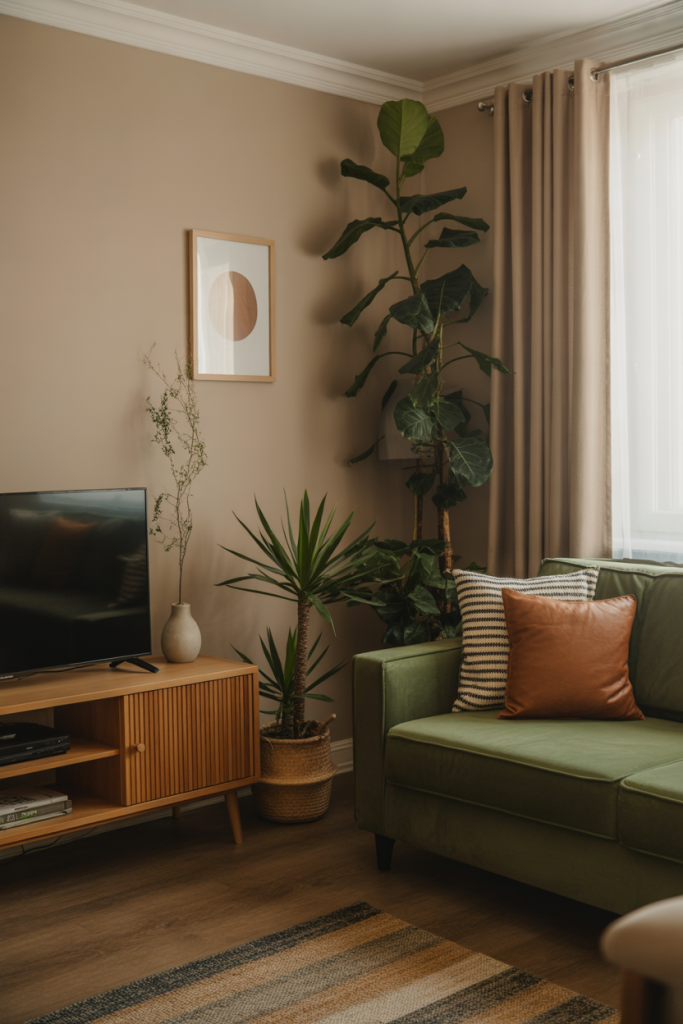 Adding a green couch or indoor plants is one of the simplest ways to bring life into your earthy living room. Green naturally ties the room back to nature, reinforcing the cozy and earth tones vibe. Even in small spaces, a corner with a tv, side lamp, and a few ferns can transform into a calming retreat. Designers often say green is timeless because it mimics what our eyes are used to outside—it instantly feels restorative.