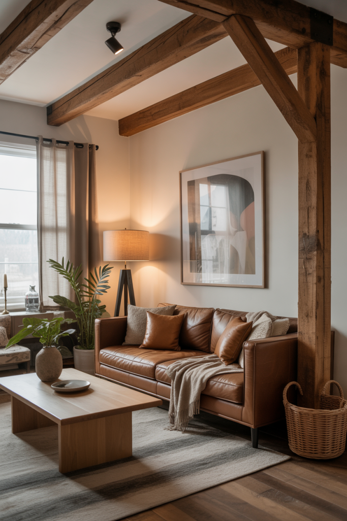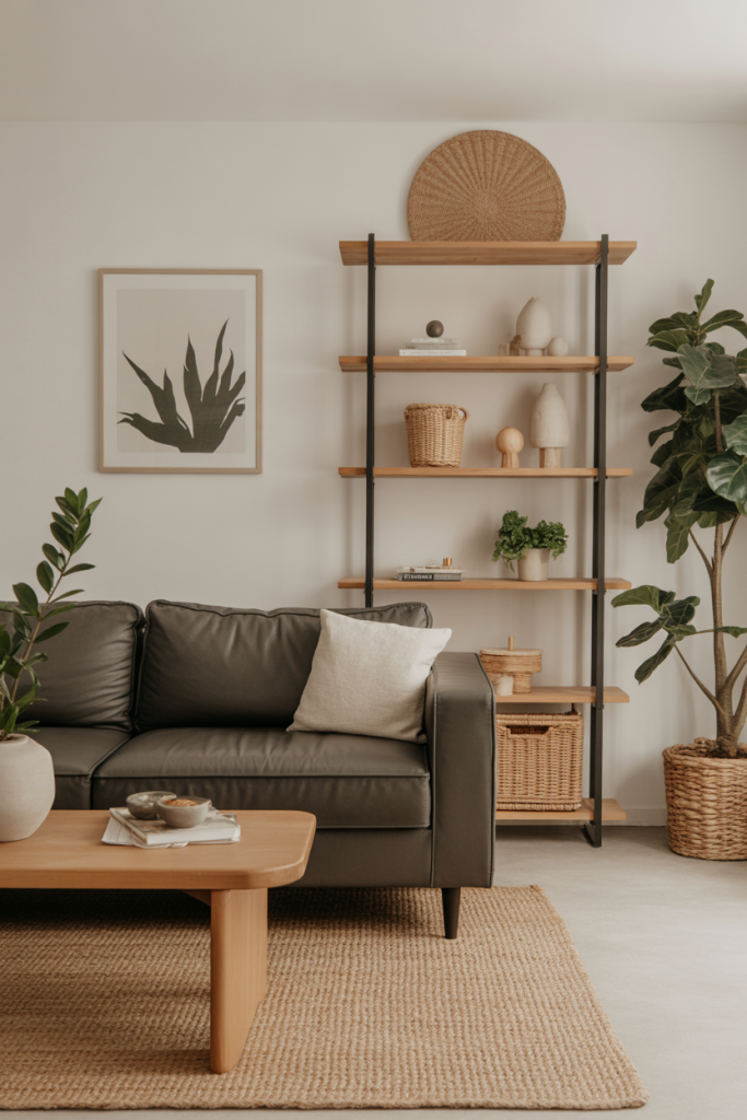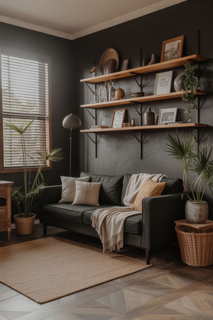 Merging rustic elements with a minimalist layout creates an earthy living room that feels fresh and uncluttered. A black couch with reclaimed wood shelving, linen curtains, and a sisal rug adds both structure and soul. The look is particularly effective in moody interiors where dark walls contrast with lighter natural fabrics. Many California designers note this hybrid works well for those who want a simple yet deeply cosy space without excess.