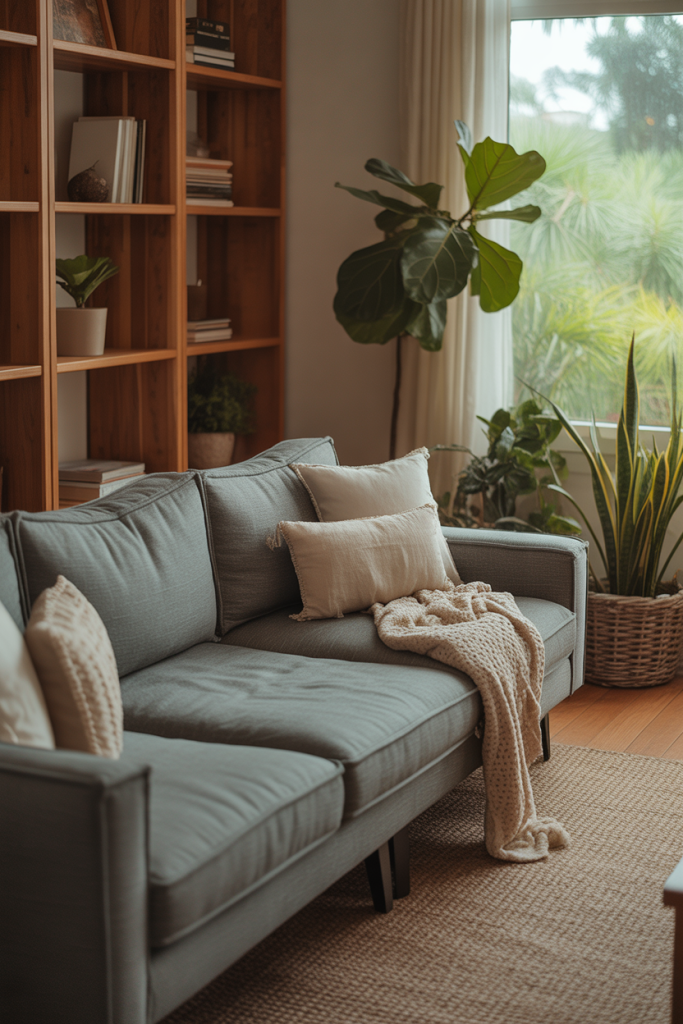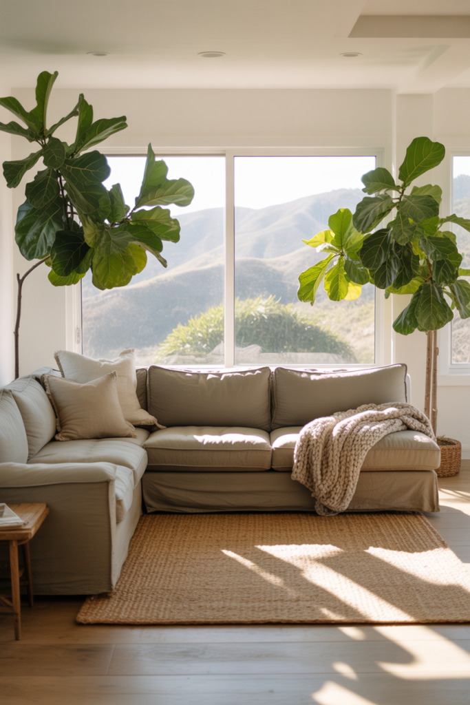 The California earthy living room is breezy, light, and grounded. A grey couch with white oak flooring, oversized plants, and woven shades creates that laid-back atmosphere. Designers like Amber Lewis have popularized the blend of organic modern and rustic touches with a West Coast twist. This style thrives on simple, airy layers—linen, sisal, and warm brown couch tones—that still feel upscale yet approachable. Perfect for those who love indoor-outdoor living.