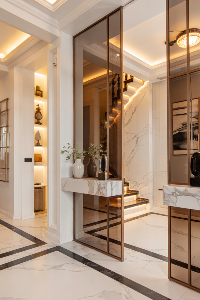 A modern luxury entry is about creating equilibrium, not gold_COLLECTION._ A marble floor, narrow consoles, or subtle lighting will speak volumes about the design, which will be absolutely silent about its richness.The design is absolutely apt for Indian or American styles, with partitions made of glass coupled with warm colors, creating the effect of welcoming warmth.