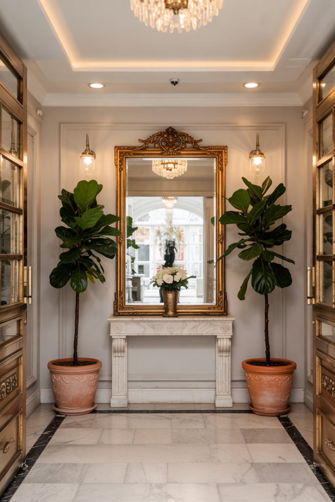 A wide front entrance can express quiet grandeur with symmetry. Twin plants, balanced sconces, and a central statement piece—like an art mirror—bring harmony. Modern luxury meets classic restraint, giving guests that magazine-worthy first impression.