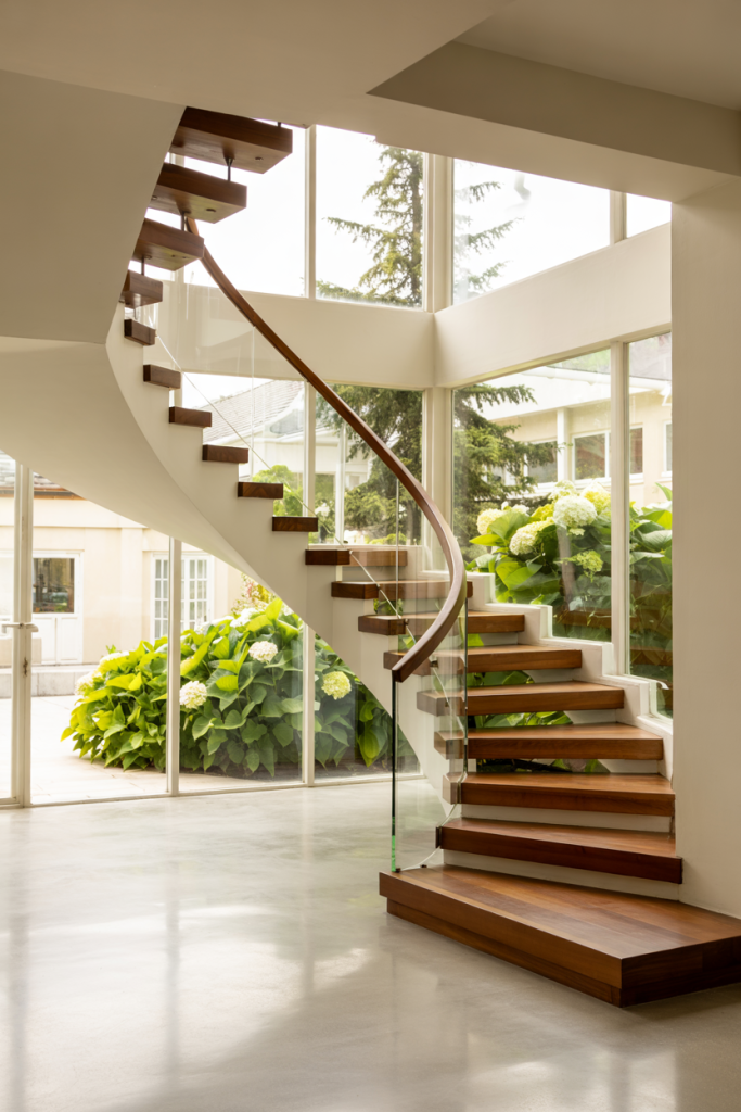 An open foyer connected to stairs feels architectural and free-flowing. Floating steps, glass railings, and a framed view into the living area create harmony. This design works beautifully in split level or modern luxury homes.