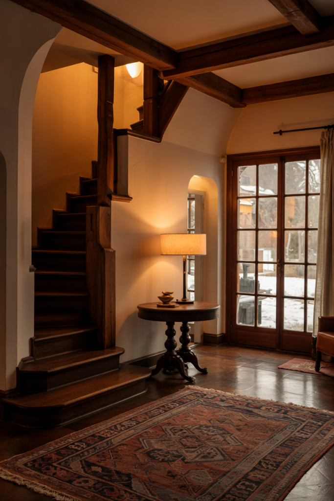 A rustic foyer feels like coming home to the countryside. Exposed wood beams, vintage rugs, and aged metal hooks bring nostalgia to a modern home. Add a reclaimed wood table under a pendant lamp for timeless charm—a warm welcome with character.