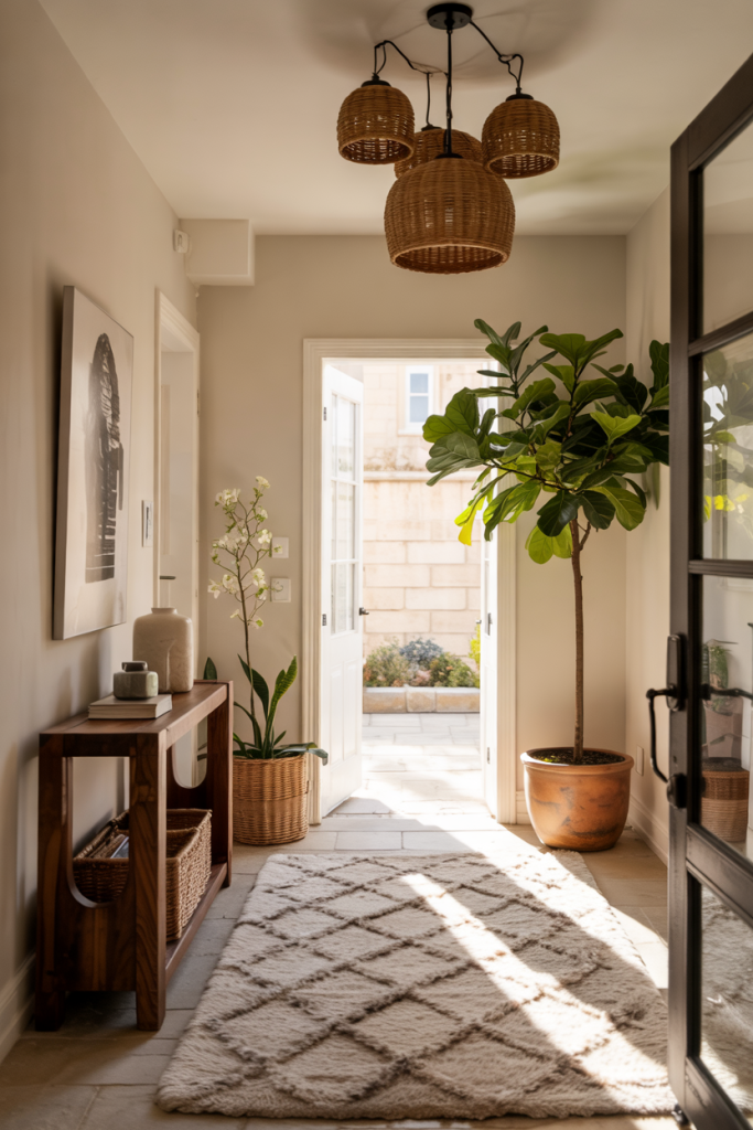 In long foyers, texture replaces clutter. Use jute runners, linen drapes, and warm wall finishes to create rhythm and comfort. Add subtle lighting to highlight the journey inward—a favorite trick from designers like Amber Lewis.