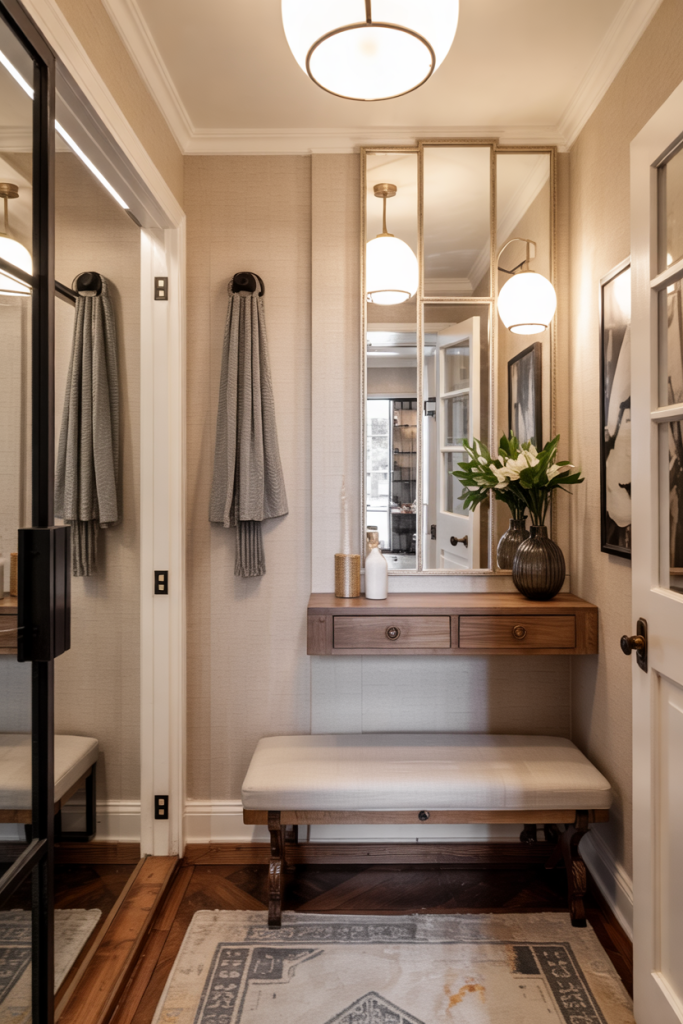 A narrow foyer can still feel elegant with clever use of mirrors, vertical lighting, and wall-mounted storage. In small front spaces, think tall artwork and slim benches that elongate the room visually. Designers like Nate Berkus recommend layering light to give the illusion of depth and calm.