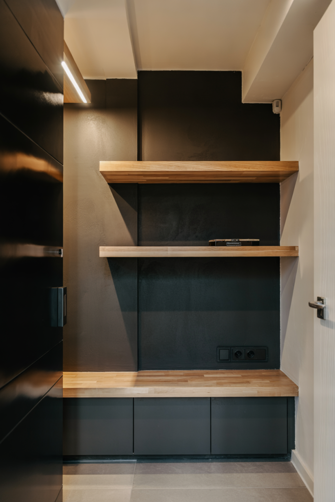 A moody industrial entrance brings raw edge and sophistication. Exposed brick, matte black metal, and soft Edison lighting set the tone for an urban home. Ideal for lofts or contemporary houses with bold character.