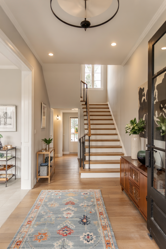 For long or open layouts, continuity is key. Use consistent flooring and a defined runner rug to lead the eye inside. Add wall art and subtle spotlights to maintain rhythm. This idea works beautifully for modern homes with stairs or open-plan living.
