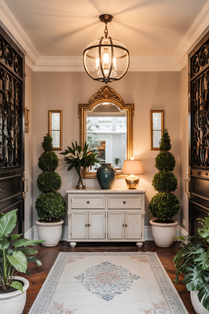 A wide front entrance can express quiet grandeur with symmetry. Twin plants, balanced sconces, and a central statement piece—like an art mirror—bring harmony. Modern luxury meets classic restraint, giving guests that magazine-worthy first impression.