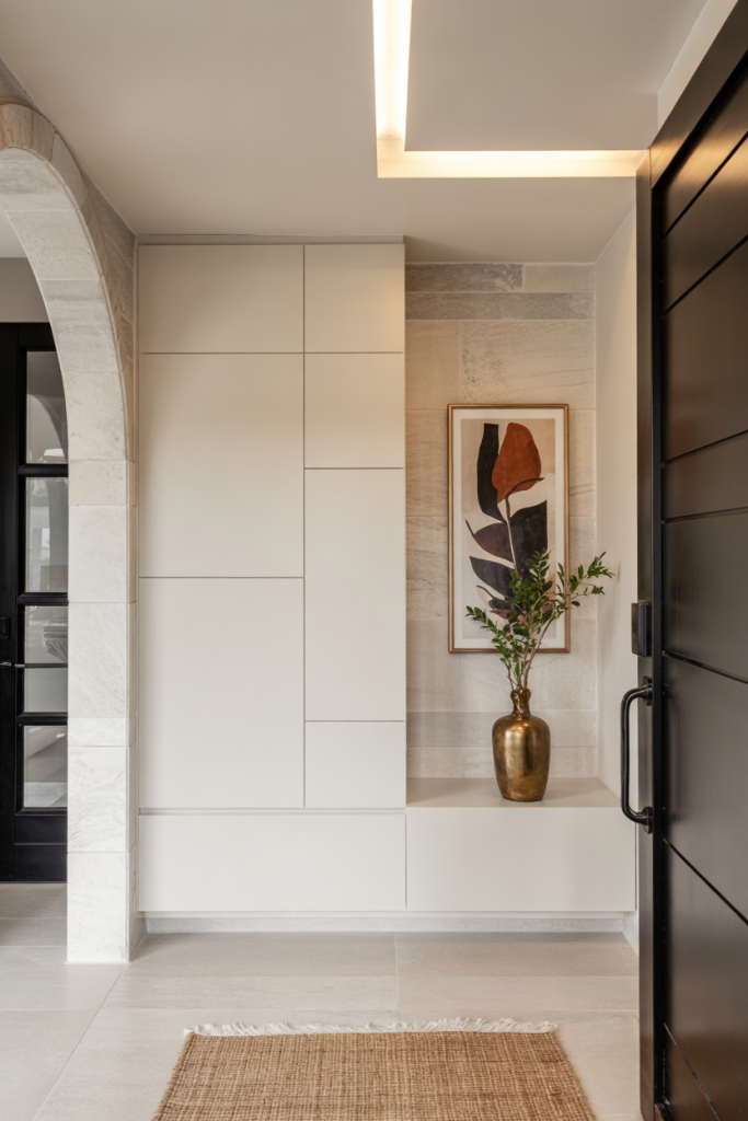 A front foyer in minimalist style celebrates open space and quiet detail. Neutral walls, hidden storage, and a single sculptural light fixture make even small front areas feel serene. Perfect for modern homes or Indian apartments, it embraces “less but better.”