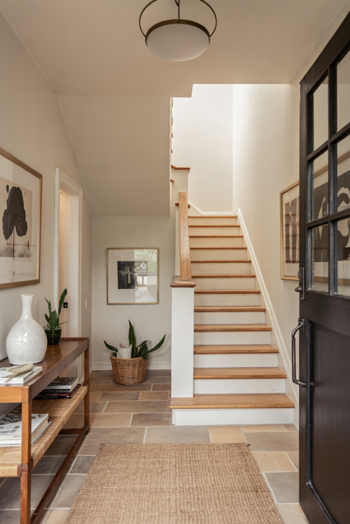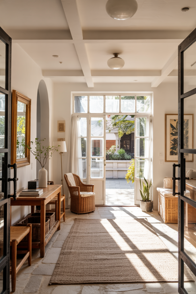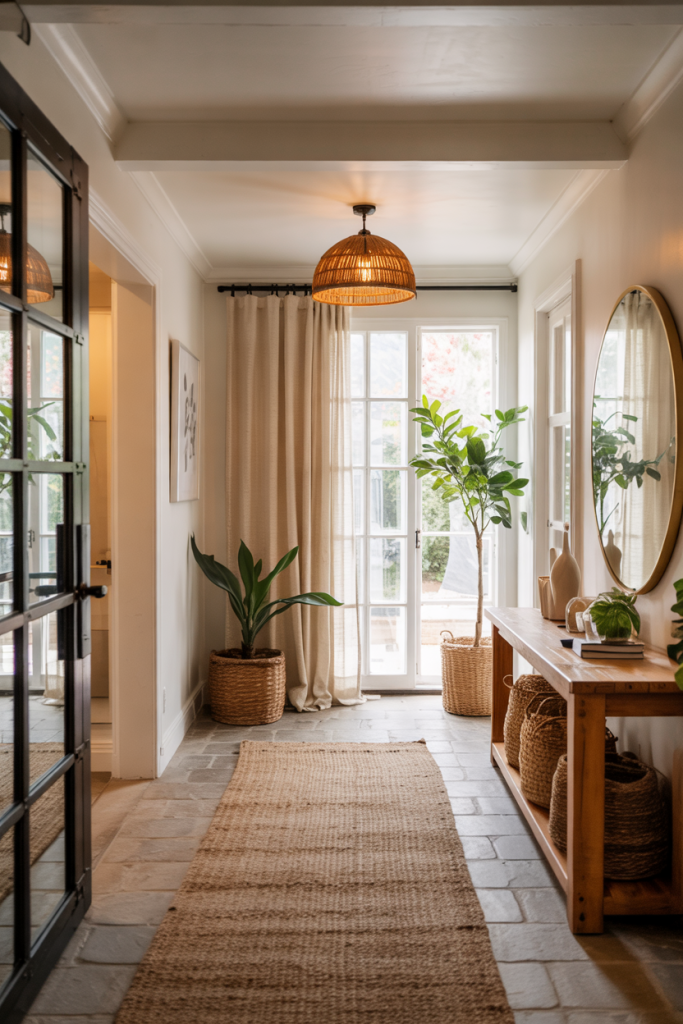 In long foyers, texture replaces clutter. Use jute runners, linen drapes, and warm wall finishes to create rhythm and comfort. Add subtle lighting to highlight the journey inward—a favorite trick from designers like Amber Lewis.