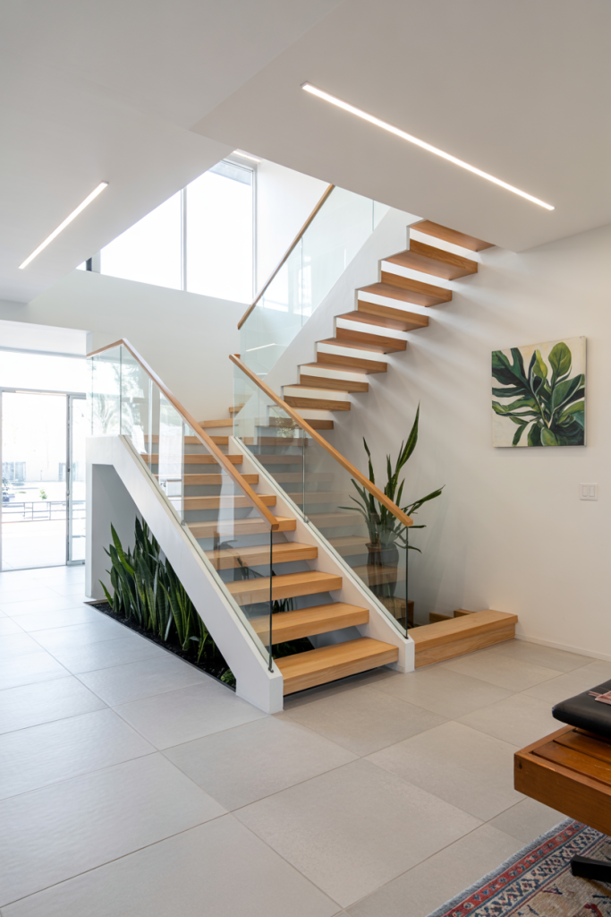 An open foyer connected to stairs feels architectural and free-flowing. Floating steps, glass railings, and a framed view into the living area create harmony. This design works beautifully in split level or modern luxury homes.
