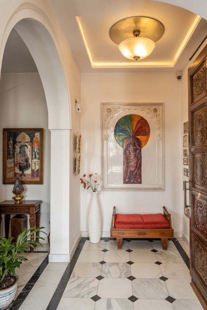 A high ceiling combined with Indian modern style turns the entryway into art. Mix marble floors with handcrafted decor, blending cultural roots and futuristic lines. It’s elegant without losing soul—a nod to the past and future.