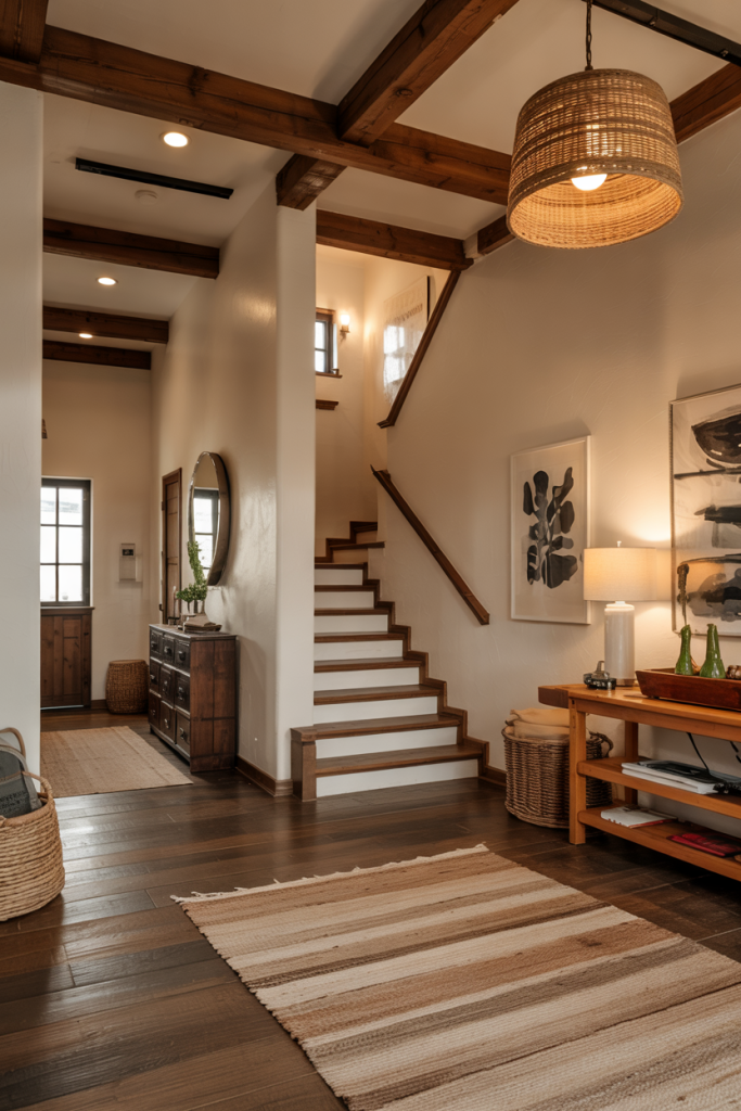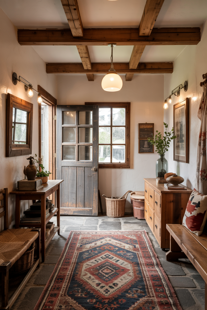 A rustic foyer feels like coming home to the countryside. Exposed wood beams, vintage rugs, and aged metal hooks bring nostalgia to a modern home. Add a reclaimed wood table under a pendant lamp for timeless charm—a warm welcome with character.