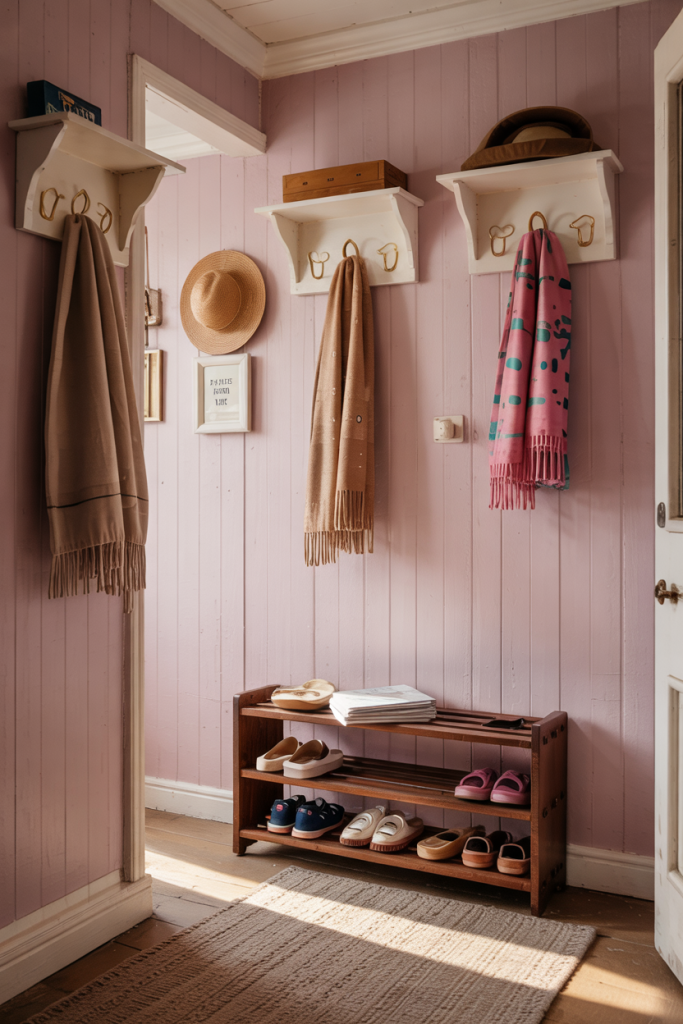 Fans of Bloxburg know that design can be playful and practical. In a tiny or small front foyer, mix pastel walls, wall hooks, and a mini shoe rack. It’s a fun, youth-driven take on efficient living that still feels personal.