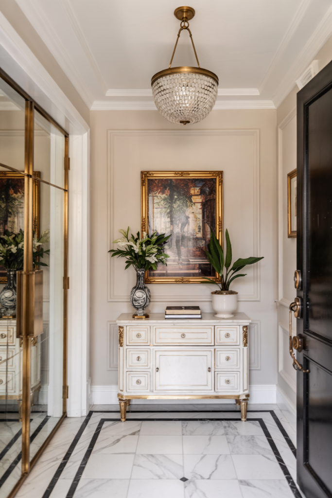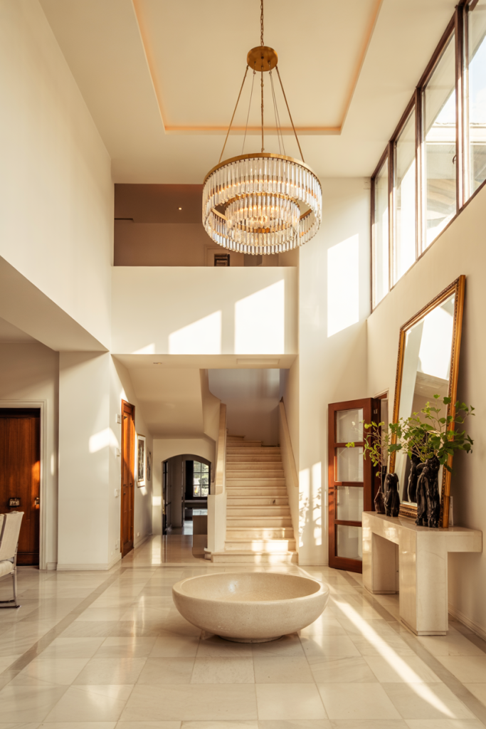 If you have a high ceiling, embrace it. Add a statement chandelier, tall mirrors, or oversized art for drama. This design suits large homes or open layouts, creating that “wow” factor right at the entrance. Architectural Digest calls such foyers “breathing spaces for design.”