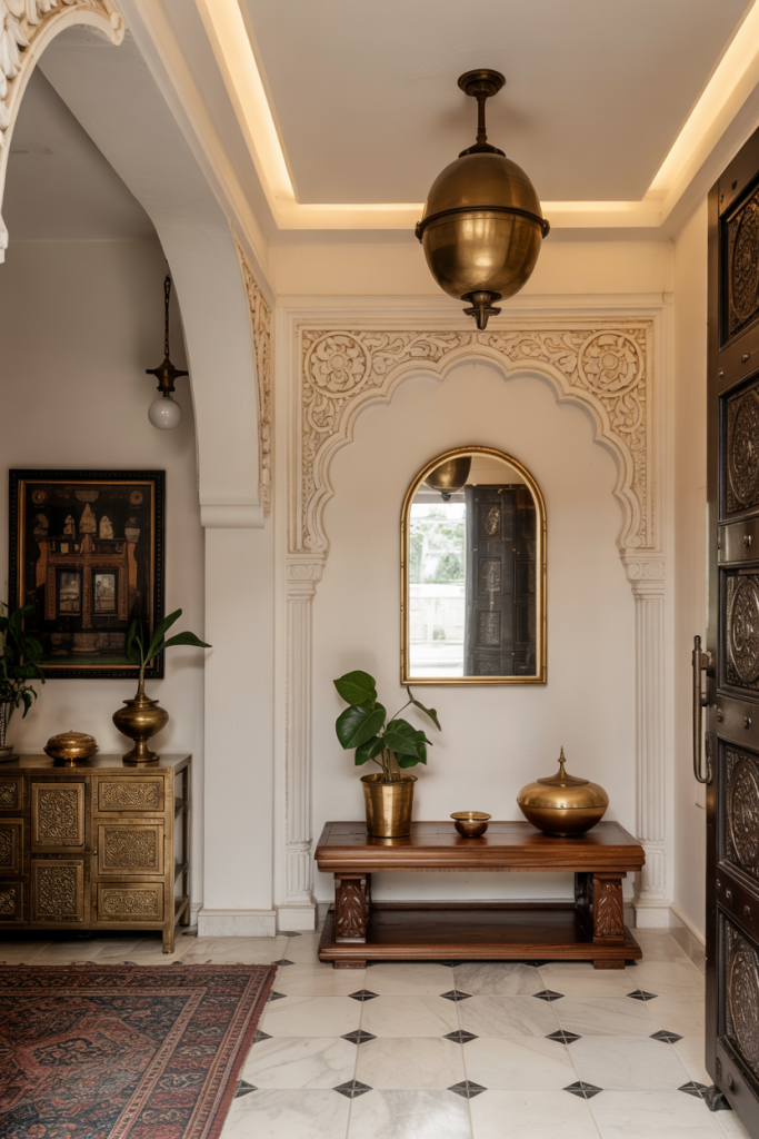 When traditional design meets modern luxury, the result is graceful balance. Use ornate mirrors, brass trays, and sleek marble floors for contrast. This combination works well in Indian homes where heritage meets modern living.