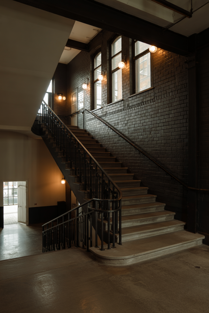 A moody industrial entrance brings raw edge and sophistication. Exposed brick, matte black metal, and soft Edison lighting set the tone for an urban home. Ideal for lofts or contemporary houses with bold character.