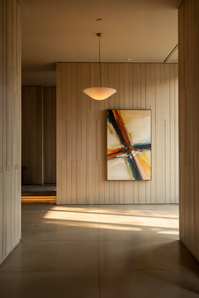 A tall foyer deserves design that matches its height. Vertical wood slats, hanging pendant lights, and framed art stretching upward create an inspiring look. This style enhances large or open layouts, adding sophistication and airiness.