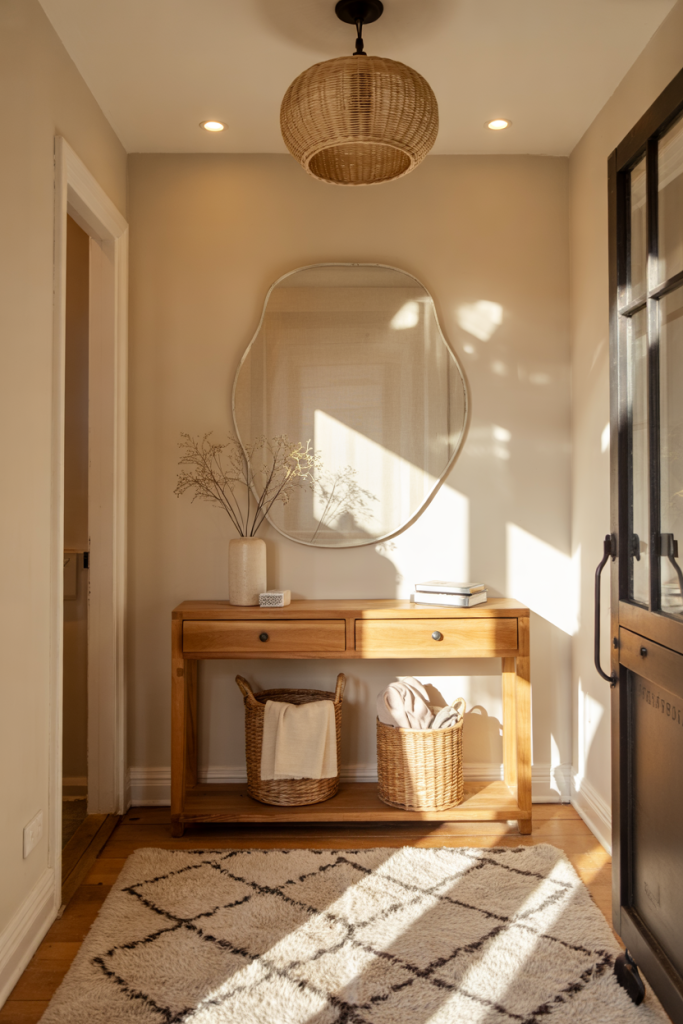 A small front entryway can feel inviting with warm neutrals, textured rugs, and layered lighting. Add a woven basket for storage and soft wall paint to make the space glow. Ideal for Indian apartments or compact homes that crave personality.