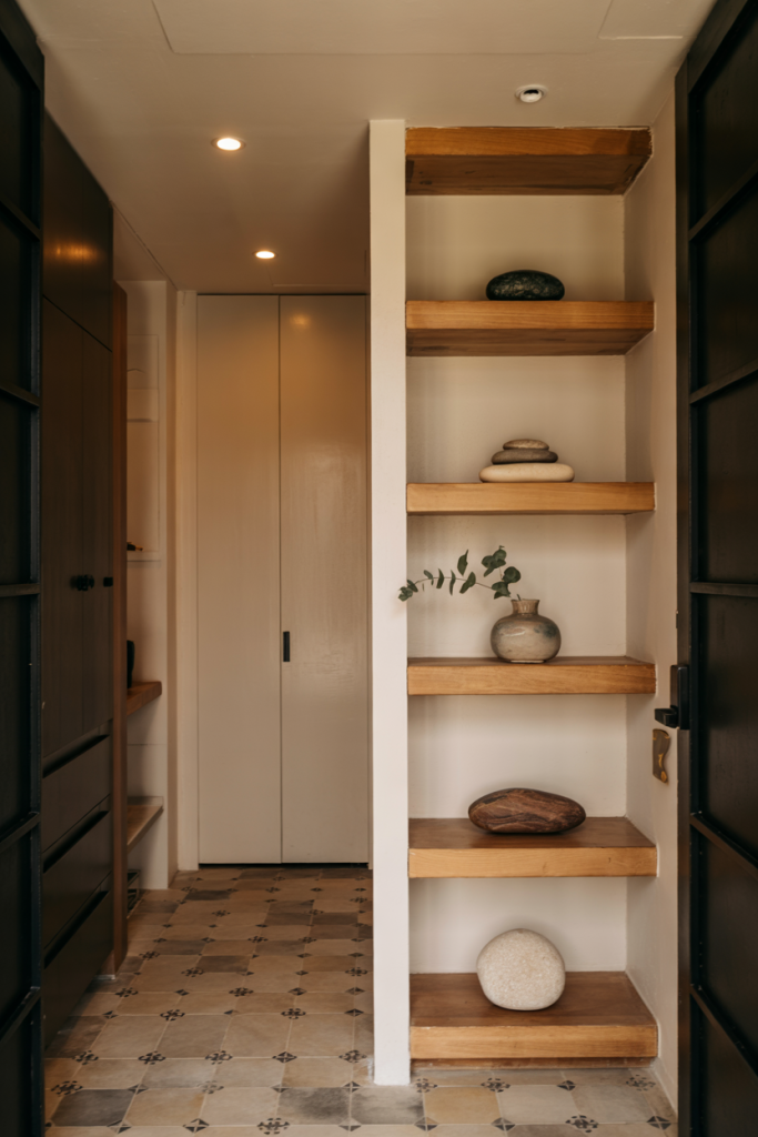 In tiny apartments or Indian homes, every inch matters. Floating shelves, concealed shoe cabinets, and vertical coat racks keep things streamlined. A pop of color—perhaps a moody navy—adds personality without clutter. Small spaces can still tell big stories.