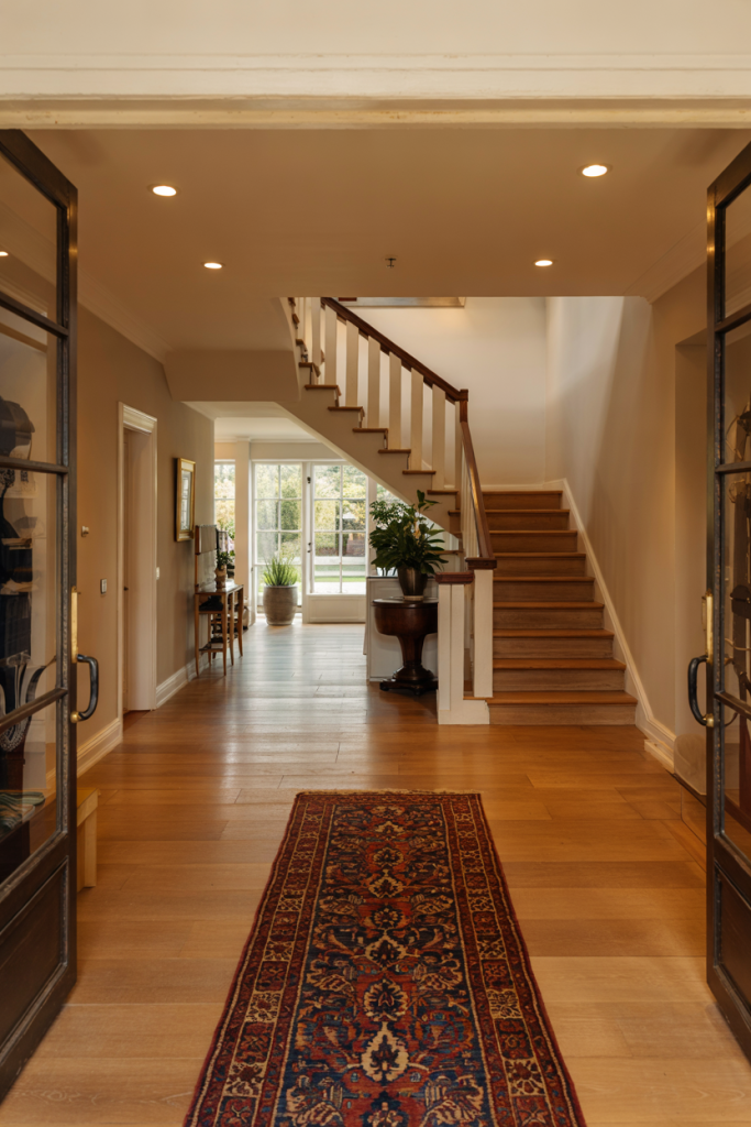 For long or open layouts, continuity is key. Use consistent flooring and a defined runner rug to lead the eye inside. Add wall art and subtle spotlights to maintain rhythm. This idea works beautifully for modern homes with stairs or open-plan living.