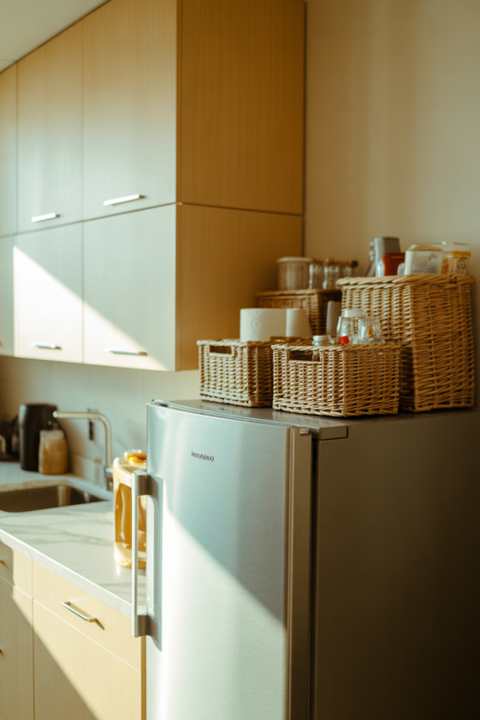 The top of the fridge becomes part of fridge organization in 2026, especially in compact kitchens. Baskets for rarely used items or backup supplies add storage without visual chaos. Even brands like Kmart influence this trend with simple, stackable solutions.