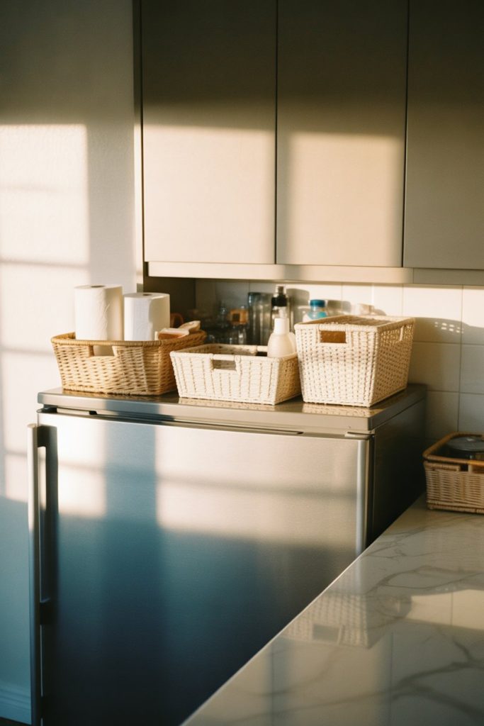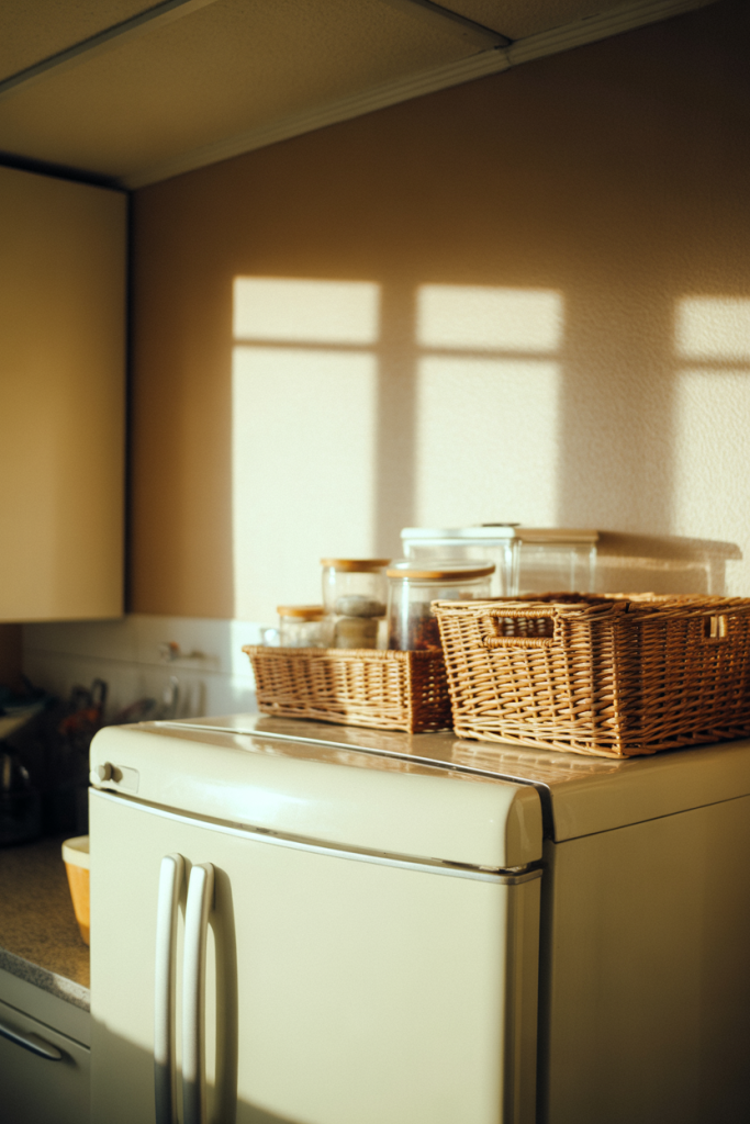 The top of the fridge becomes part of fridge organization in 2026, especially in compact kitchens. Baskets for rarely used items or backup supplies add storage without visual chaos. Even brands like Kmart influence this trend with simple, stackable solutions.