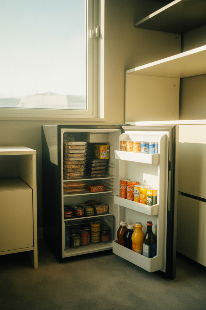 A common mistake is overcrowding shelves with loose packaging. Leaving small gaps for airflow keeps food fresher longer and prevents forgotten items from disappearing into the back—a small detail that makes dorm life easier.