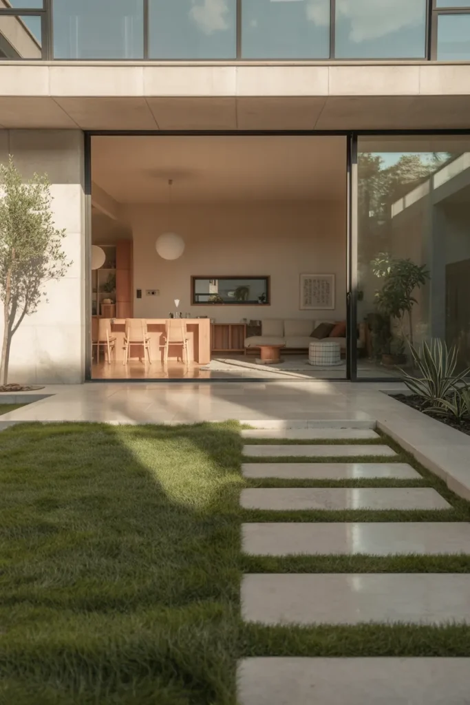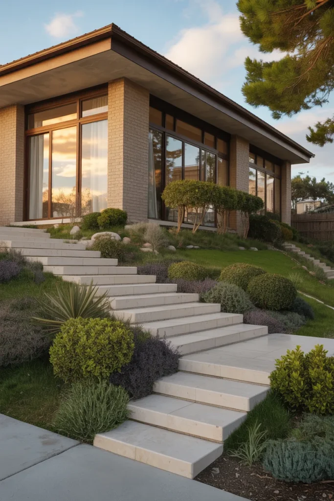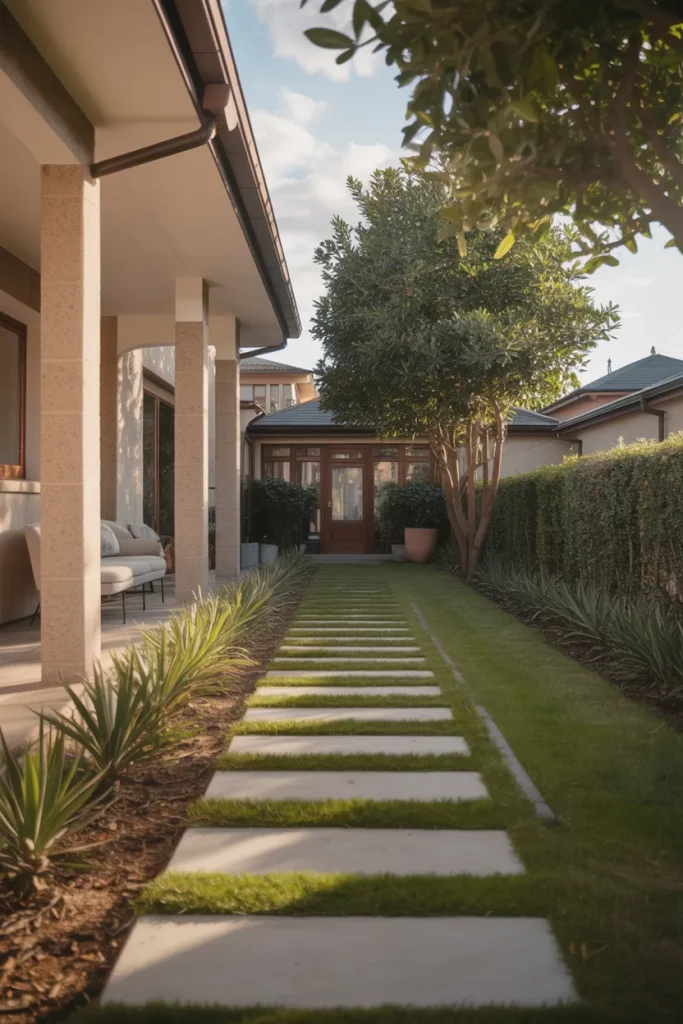 This idea rethinks grass as a design feature rather than filler. Rectangular lawn panels framed by stone or concrete create a modern rhythm that feels intentional and calm. It works well for homes that want visual order without sacrificing greenery, especially on lots where symmetry strengthens curb appeal.