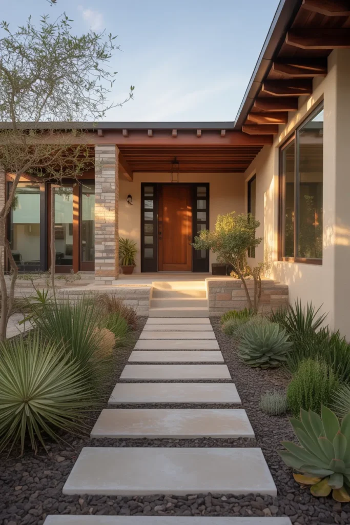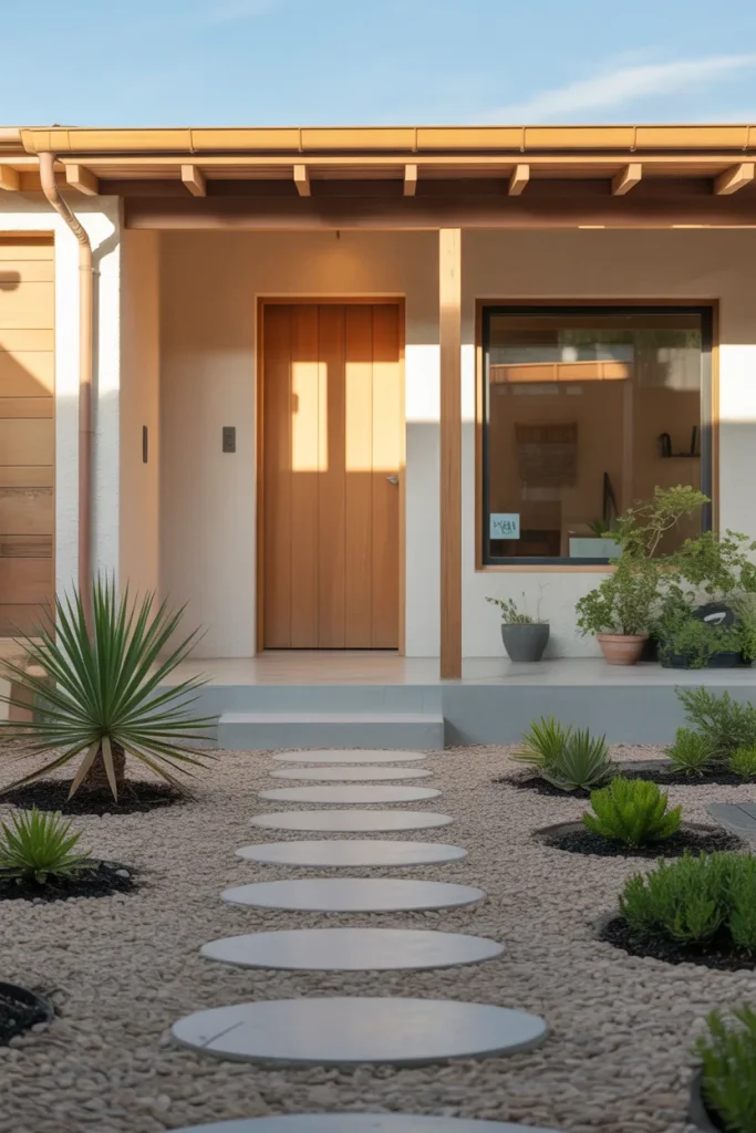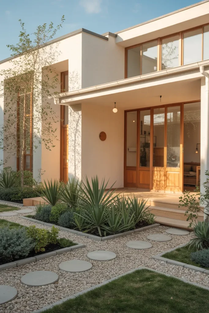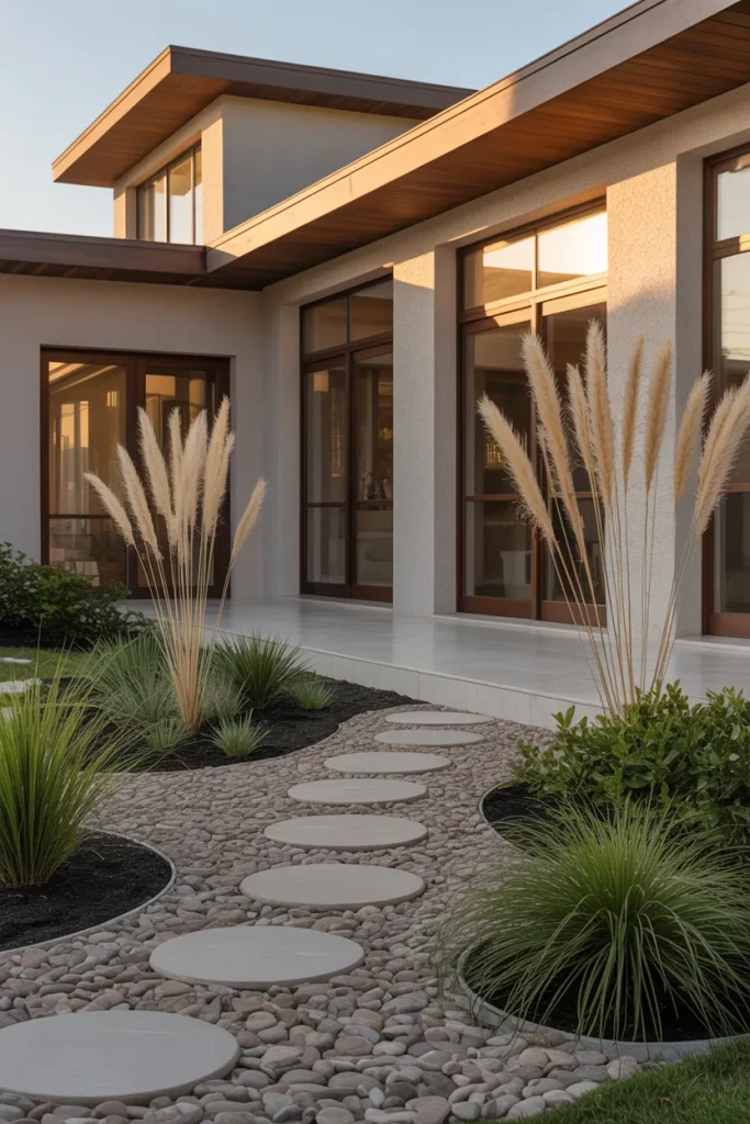 This front yard idea blends ornamental rocks with flowing grasses to create a relaxed yet structured look. Instead of traditional flower beds, the design relies on texture and movement, which feels very current for 2026. It suits homes that want a natural rhythm without losing a modern edge, and it instantly improves curb appeal without feeling overdesigned.