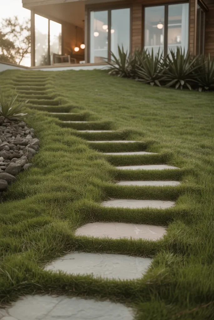 A sloped yard can feel intentional with the right structure. Natural stone steps break up the incline while keeping a soft lawn feel. This approach suits properties where grass still plays a central role, but access and safety are equally important.