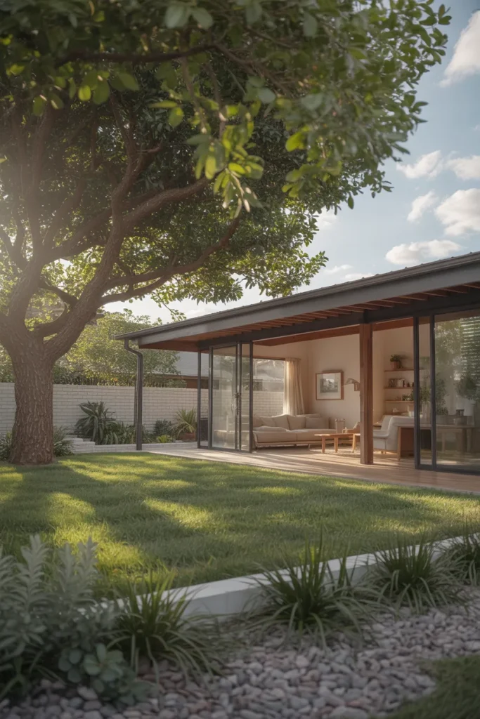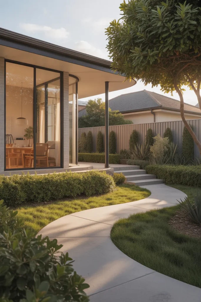 Homeowners often adapt this layout over time, adding shade elements or seating near the entry as the yard becomes part of daily routines rather than just a visual buffer.