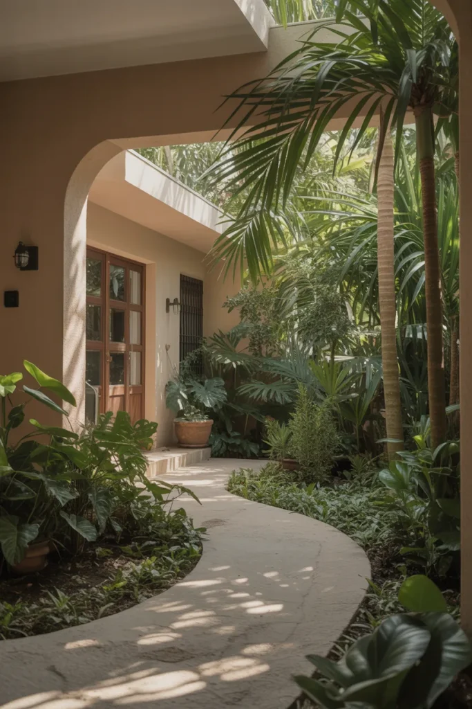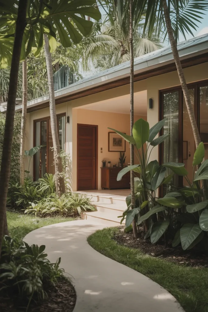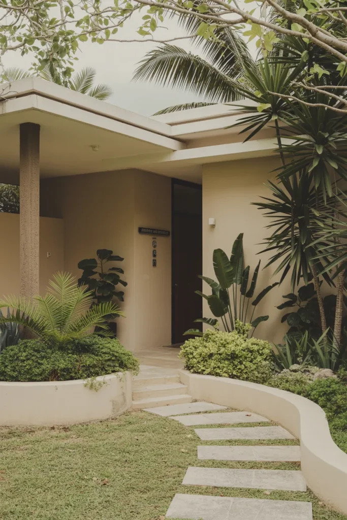 A Florida front yard embraces bold foliage and layered greens. Instead of rigid symmetry, plants spill naturally toward paths, creating a soft enclosure. It pairs well with easy maintenance choices that tolerate heat and humidity.