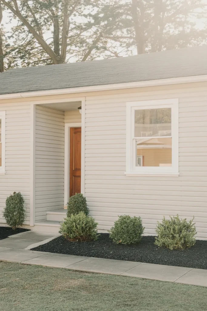 An easy front yard doesn’t mean boring. Mulch beds paired with a few well-chosen shrubs create contrast and depth while staying low-effort. This layout suits homeowners who want a tidy appearance without weekly upkeep and works across many home styles.