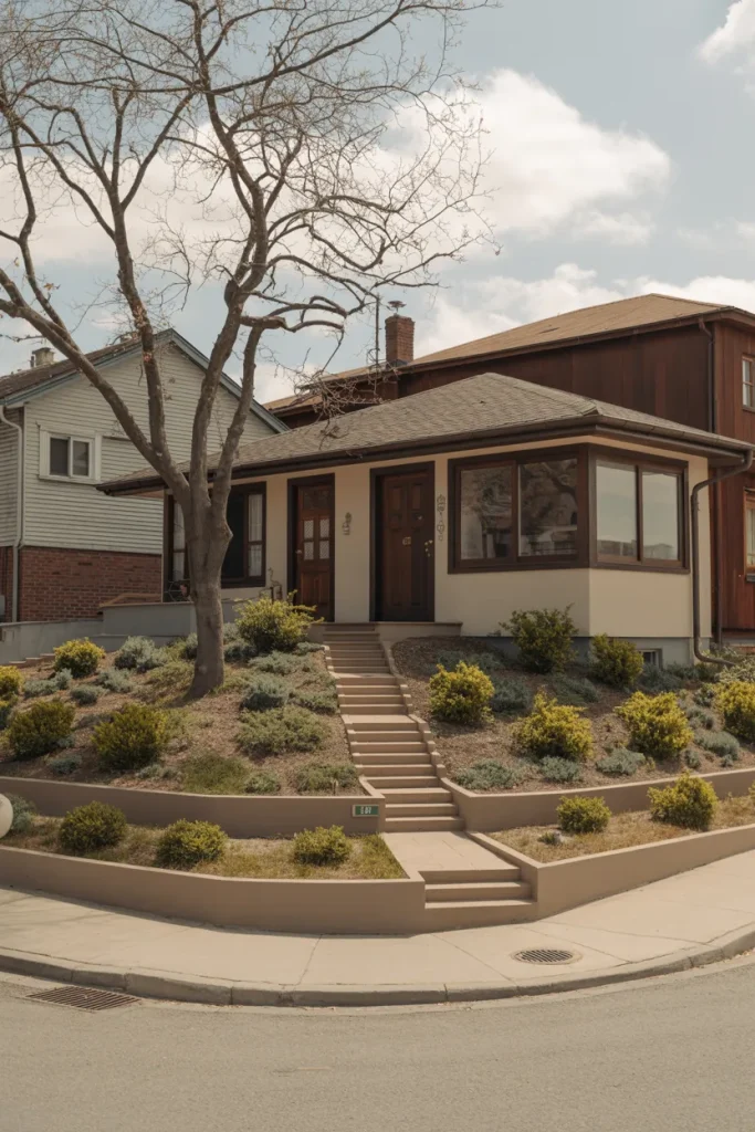 A sloped front yard can actually be a positive thing, and it does not have to feel like a challenge. A range of soft tiers can be used to break the slope and create an effective visual rhythm and usable planting zones. With such an approach, grass paths and low retaining edges work to guide the eye upwards. Large lots are best to be used for this approach, as it provides a natural-looking change in elevation where there is lots of slope.