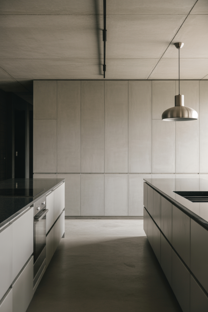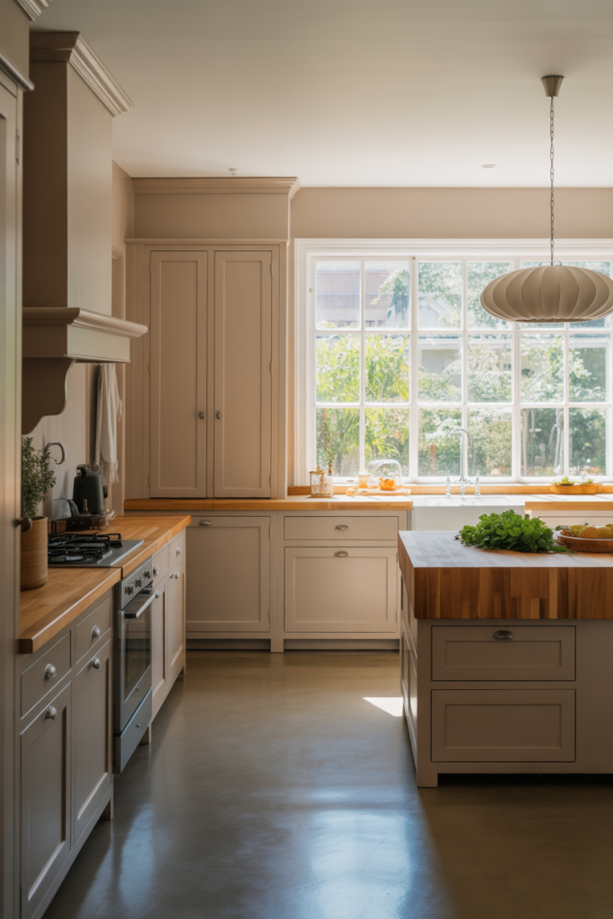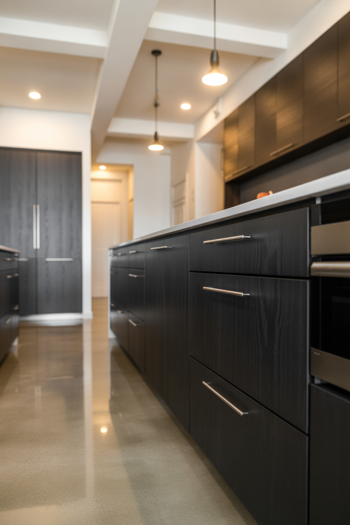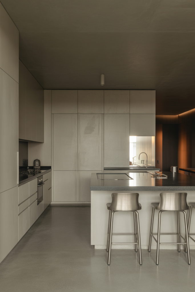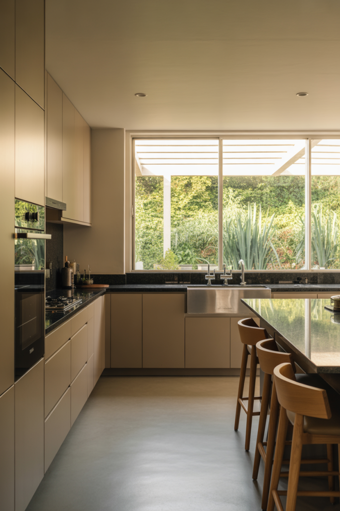 If your heart beats for modern minimalism, concrete floors on black granite counters are the perfect backdrop for soft taupe cabinets. It feels masculine and refined, while the subtle painted textures keep it approachable. It is an ideal match for open-plan homes where simplicity flies with statements.