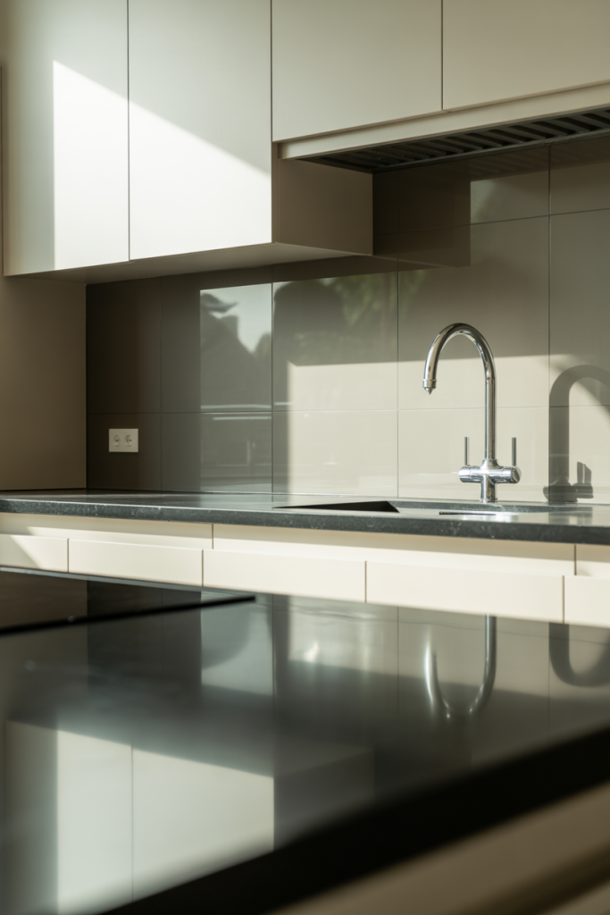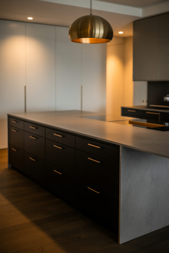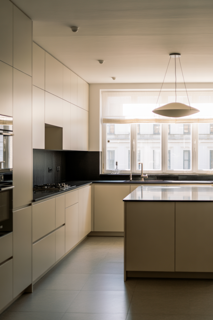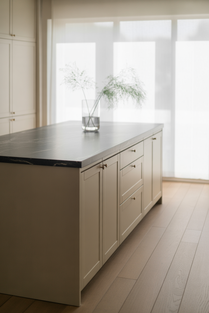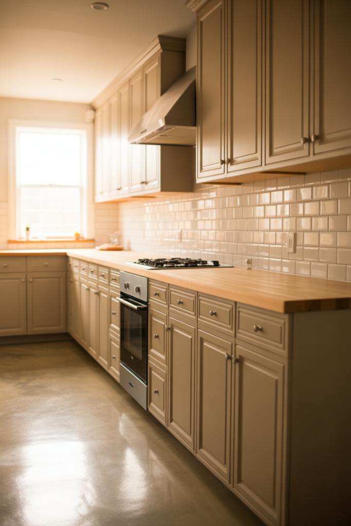 If your heart beats for modern minimalism, concrete floors on black granite counters are the perfect backdrop for soft taupe cabinets. It feels masculine and refined, while the subtle painted textures keep it approachable. It is an ideal match for open-plan homes where simplicity flies with statements.