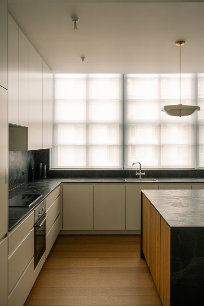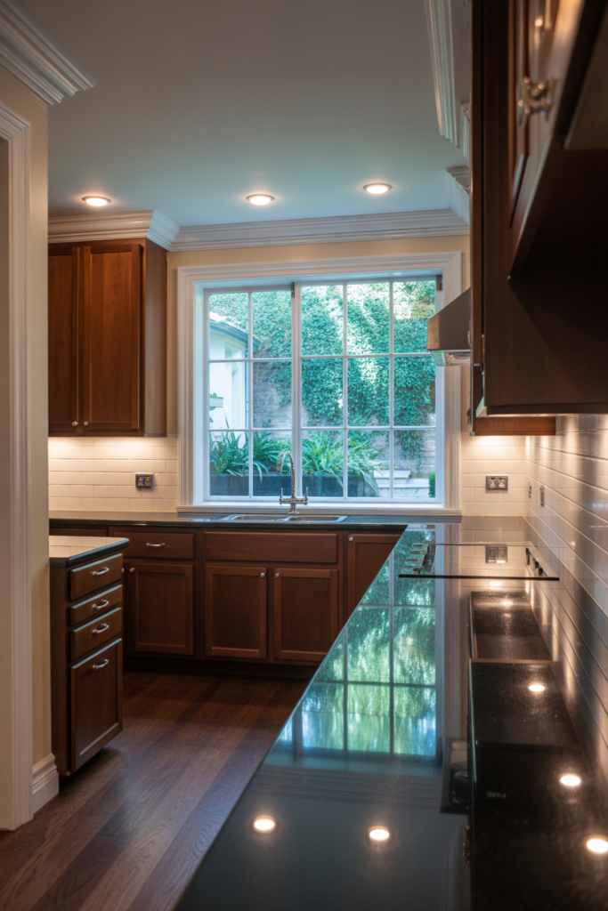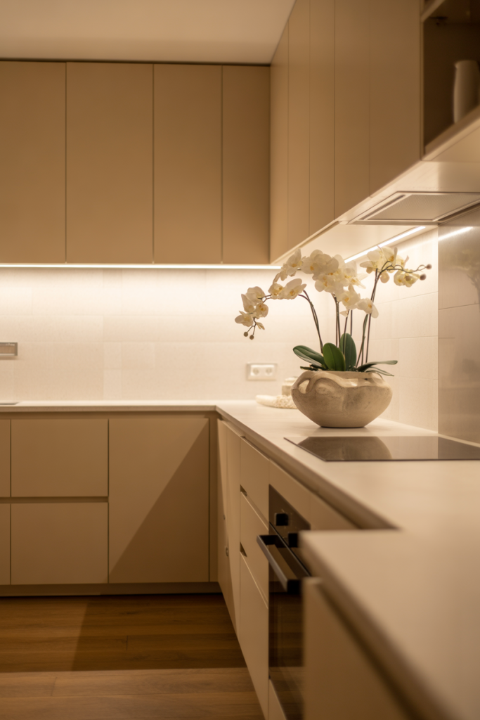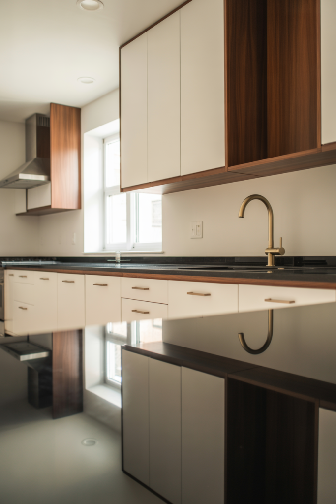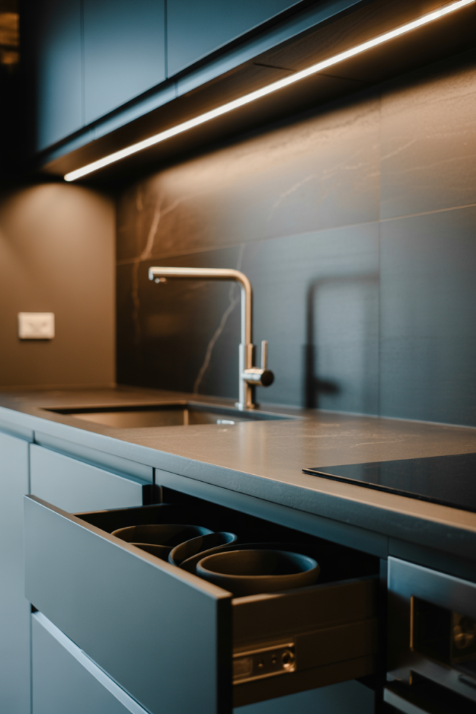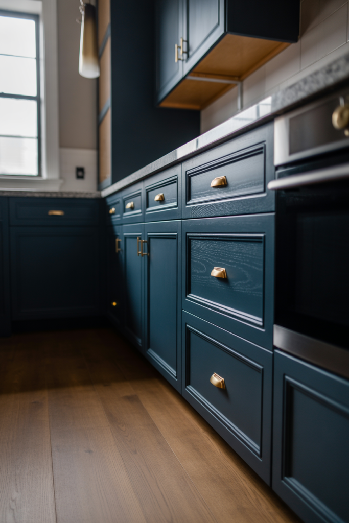 Dark navy painted cabinets give a moody yet classic appeal when paired with brass handles and wood floors. The tone feels luxurious, not heavy — a design trick popular in high-end Indian kitchens. It’s the kind of color that makes late-night cooking feel cinematic.