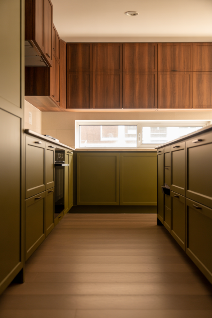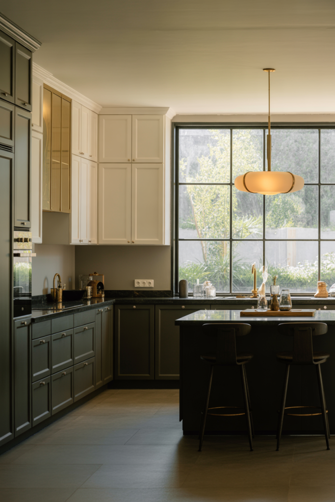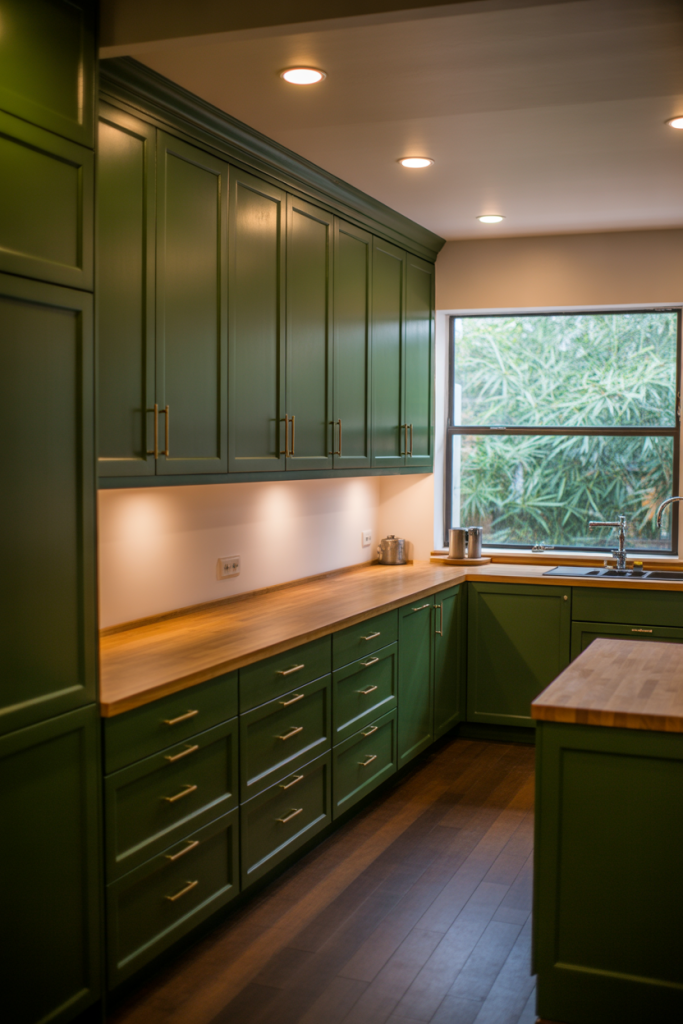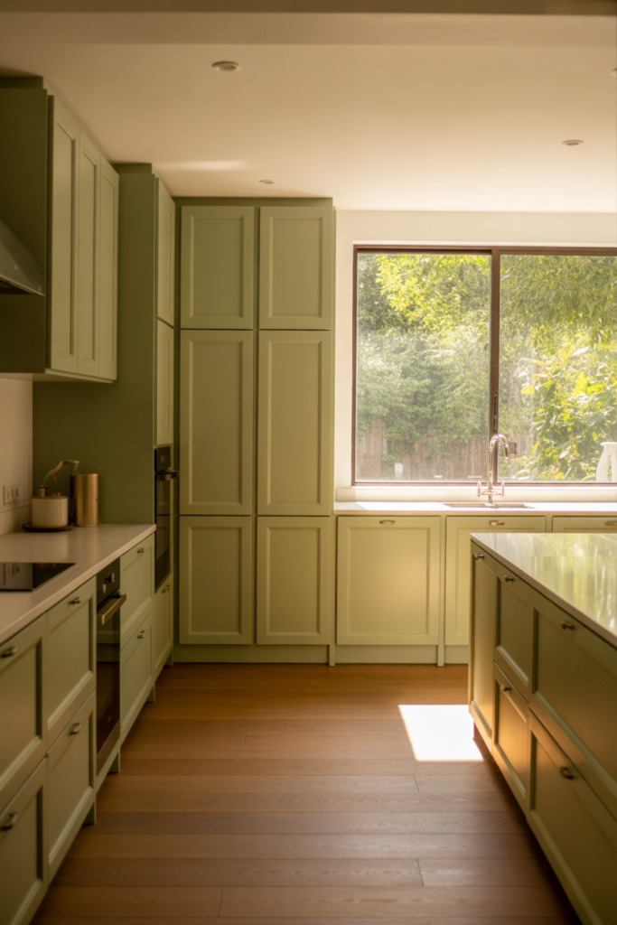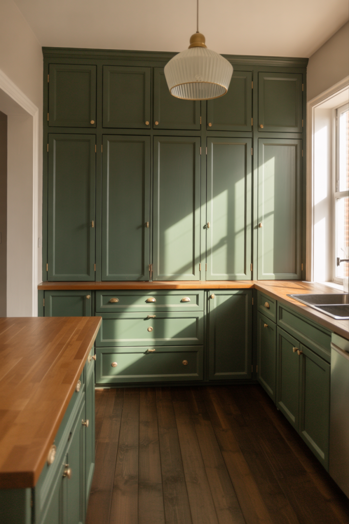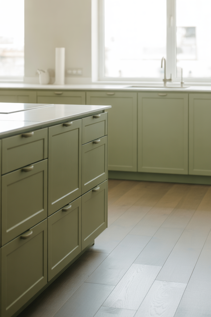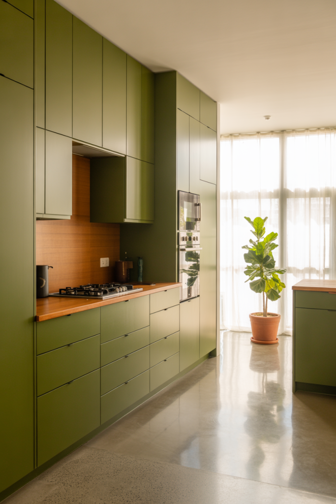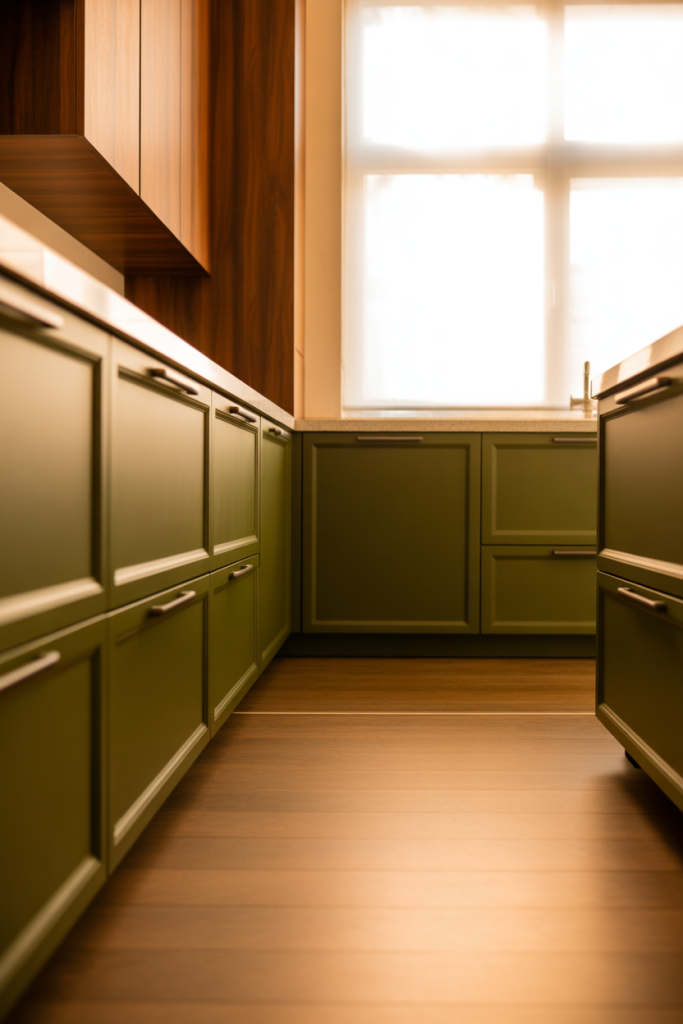 Pairing green olive tones with wood floor or walnut accents creates richness and character. This light and dark two tone balance mixes natural materials and earthy warmth. Ideal for homeowners that want something unique yet enduringly classic.