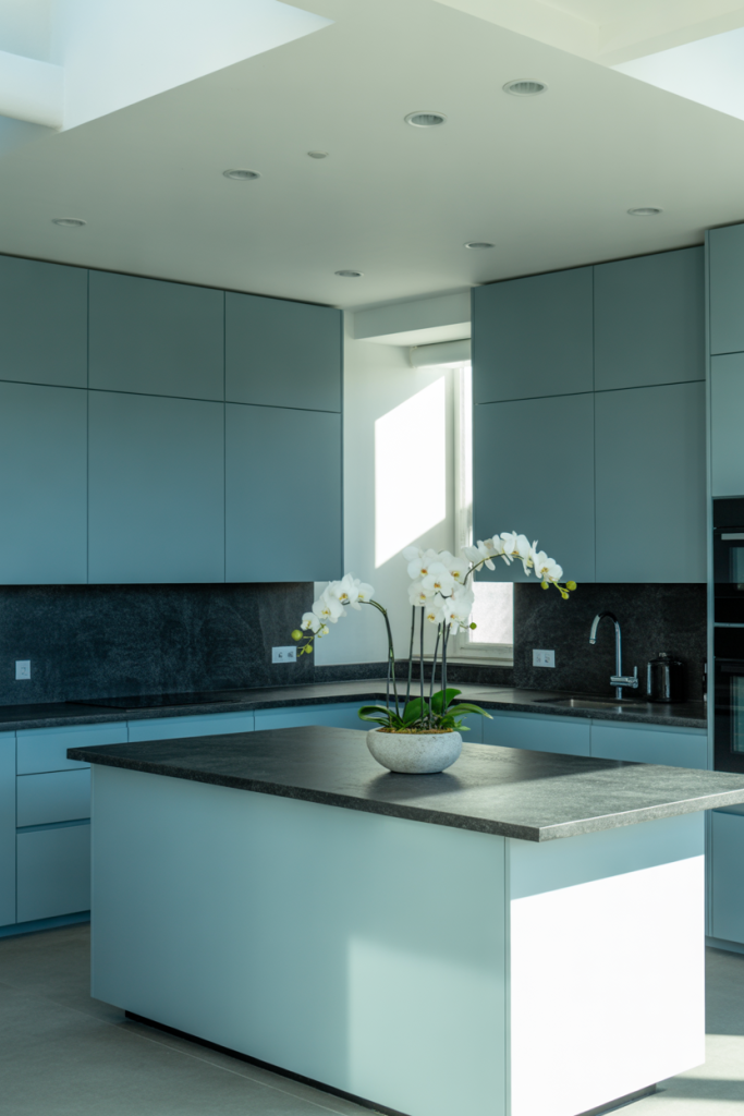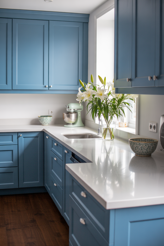 The blend of blue with gray establishes a coastal relaxation vibe that feels airy-a-bit-so and downscale. Dark tops and white counter top islands provide a contrast. This two-tone set reminds you of the ocean horizon and is ideal for anyone looking for a calm spirit in a hectic life.