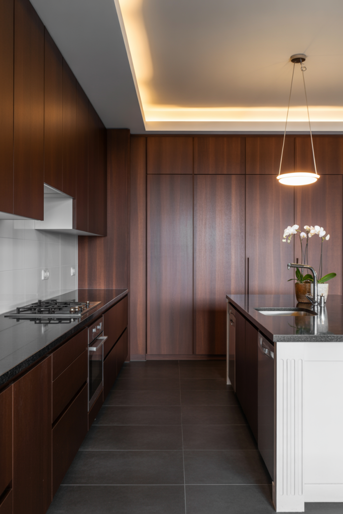Modern homeowners embrace black slab cabinetry as a statement of sleek luxury. In combination with dark brown floors or subtle brass hardware, it ceases to be cold and turns into something very inviting. Always going to be a confident but grounding statement, this one fits perfectly in the homes of the unabashedly design forward.