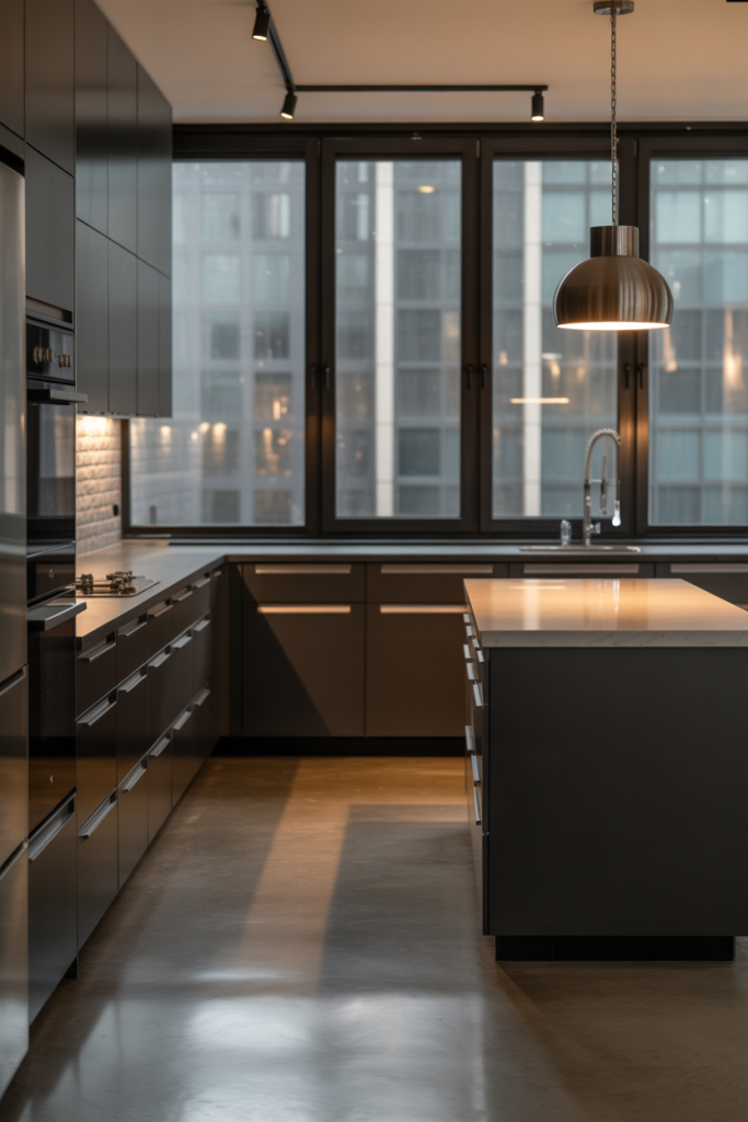 Pairing sleek black slab and charcoal cabinets with concrete floors results in a bold, minimalistic aesthetic. The tone is right for the new-build loft if softened by natural materials.