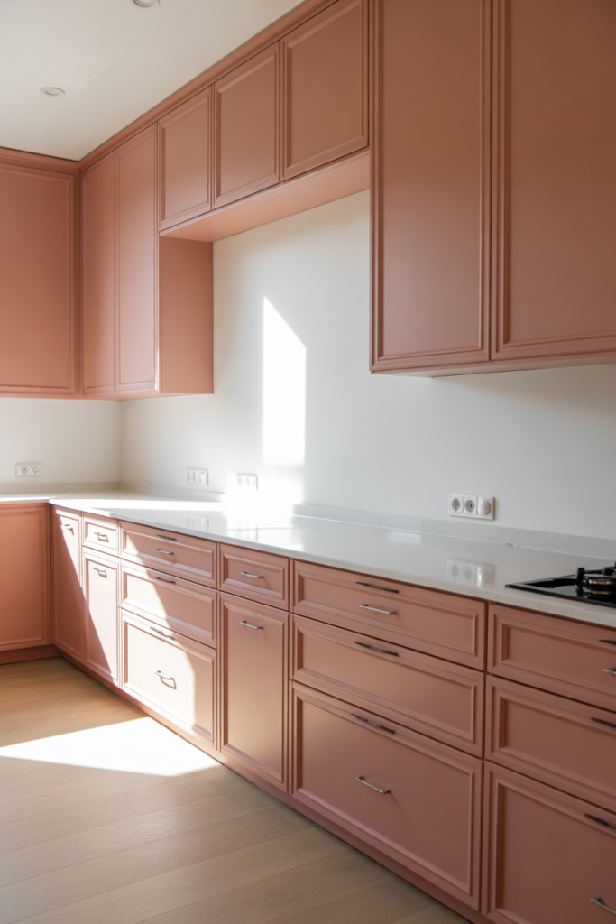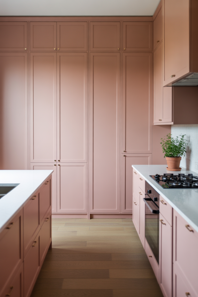 A muted, painted dusty rose provides soft warmth to any small space, blending beautifully with white countetops and wood floors. The color feels nostalgic and modern, lying in the sweet spot between gentle femininity and contemporary flair. Designers love it for adding a quiet personality to spaces sans the loud overhead.