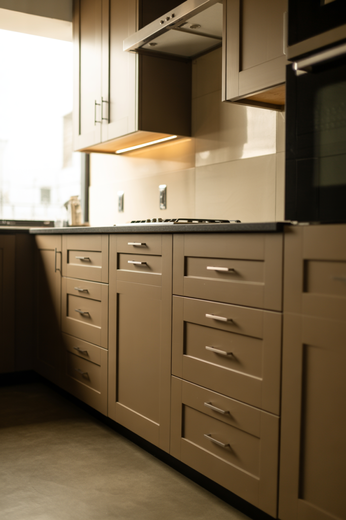 The painted taupe finish feels welcoming and earthy, especially if paired with butcher block counters and concrete floors. There are aesthetic values of utility and modern craftsmanship imbued in this style. Its earthy tones allow kitchens to connect with nature, the heart in every sense.
