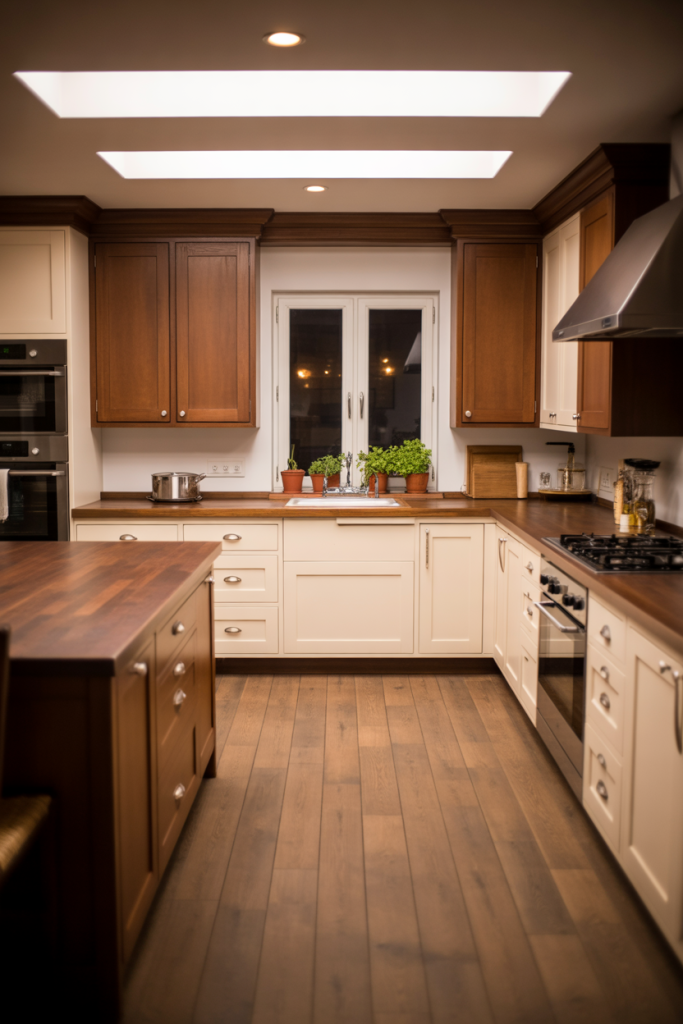 Deep brown floors tell loud stories and demand to be matched with cabinets that can echo the depth of the gorgeous wood. The tone brown and white contrast bring out the organic wood texture with a blend of tradition and elegance. This pairing that will never go out of style works well with black granite counters to further spotlight the natural grain and warmth.