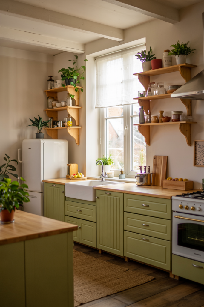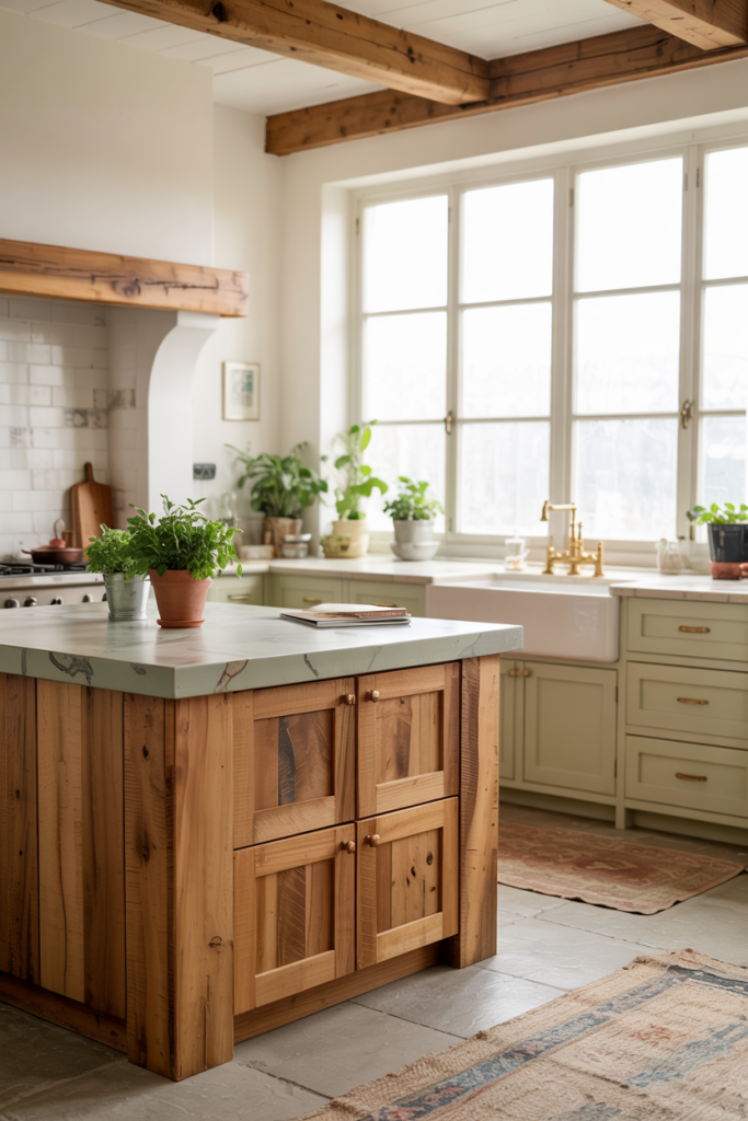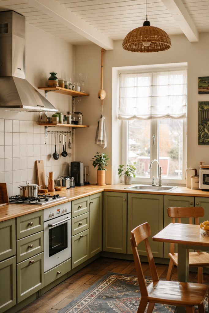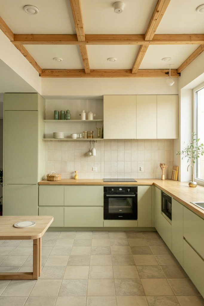 Nothing says calm like wooden cabinets paired with soft green tones. This natural pairing defines 2026’s eco-luxury look. It brings the outdoors inside, creating a peaceful place for cooking and socializing. Add plants near a window for an organic feel — proof that sustainable design ideas can also be incredibly stylish.