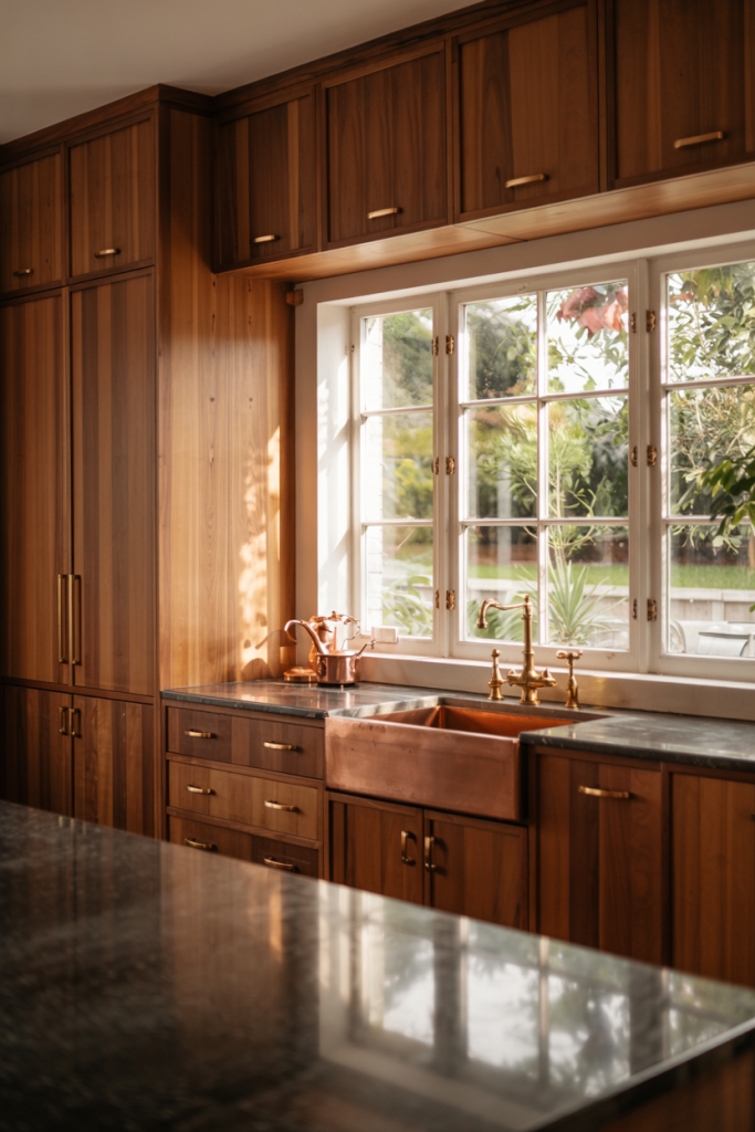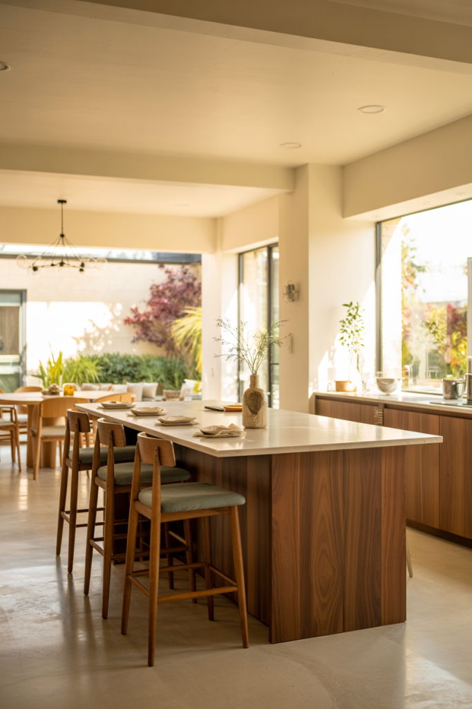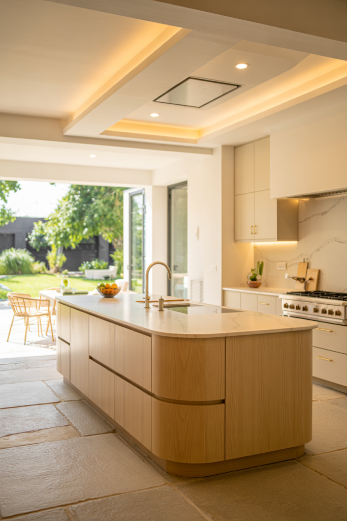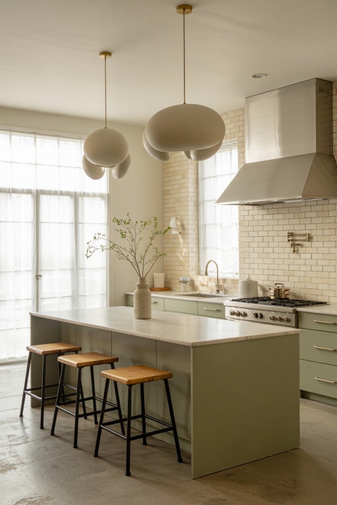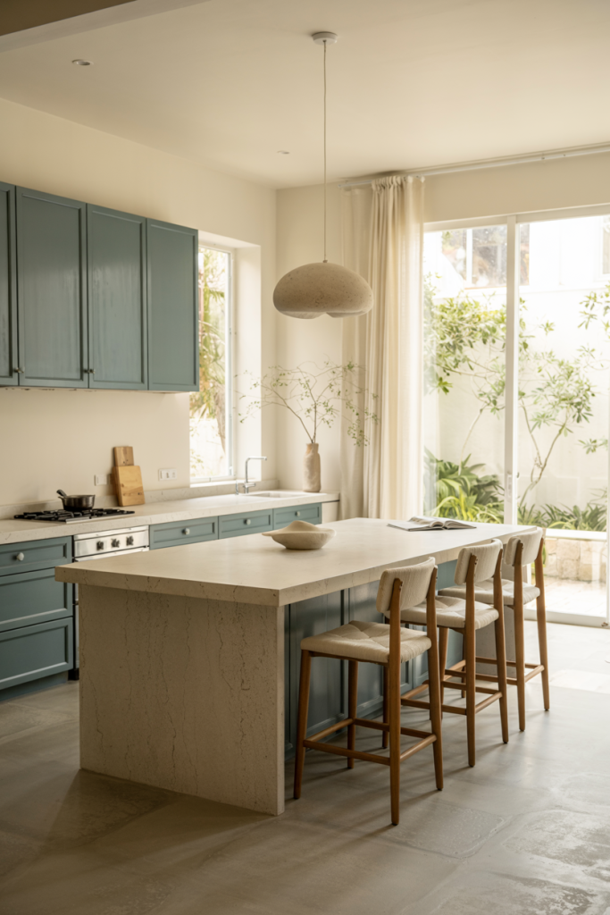 Nothing says calm like wooden cabinets paired with soft green tones. This natural pairing defines 2026’s eco-luxury look. It brings the outdoors inside, creating a peaceful place for cooking and socializing. Add plants near a window for an organic feel — proof that sustainable design ideas can also be incredibly stylish.