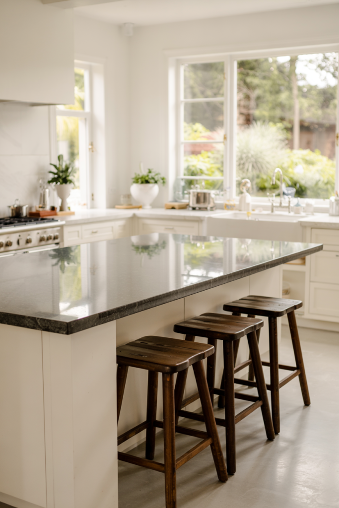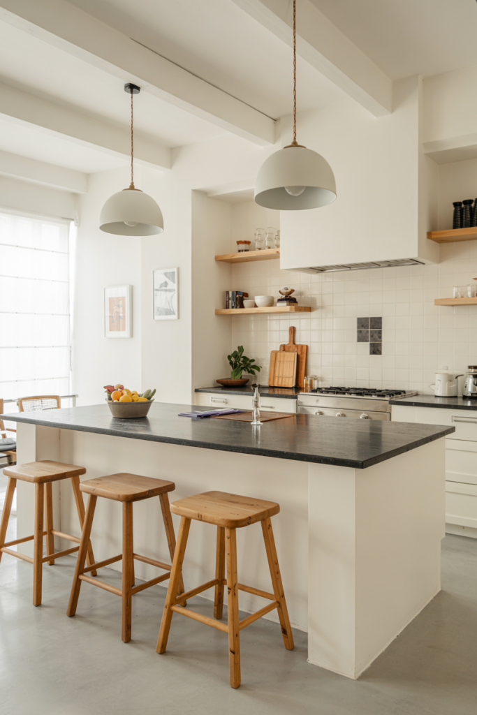 A white kitchen never goes out of style, but in 2026, designers pair it with dark contrasts and warm textures. A design modern approach brings balance through sleek cabinets, matte finishes, and a black granite top for a subtle touch of drama. Wooden accents or woven stools add just enough warmth to avoid sterility — creating timeless elegance for every home.