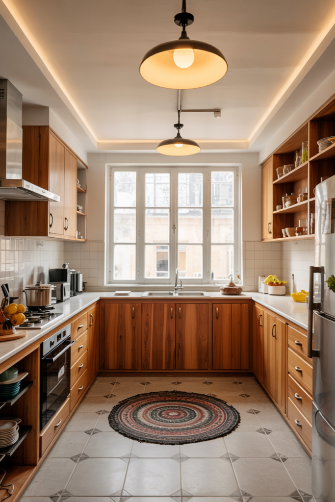 For narrow homes, the parallel kitchen layout is still unbeatable. Two counters facing each other provide an efficient workflow and strong symmetry. Many homeowners enhance these layouts with window views or mirrored backsplashes to open up the space. A design modern small Indian approach here creates an elegant, functional look that feels both cozy and contemporary.