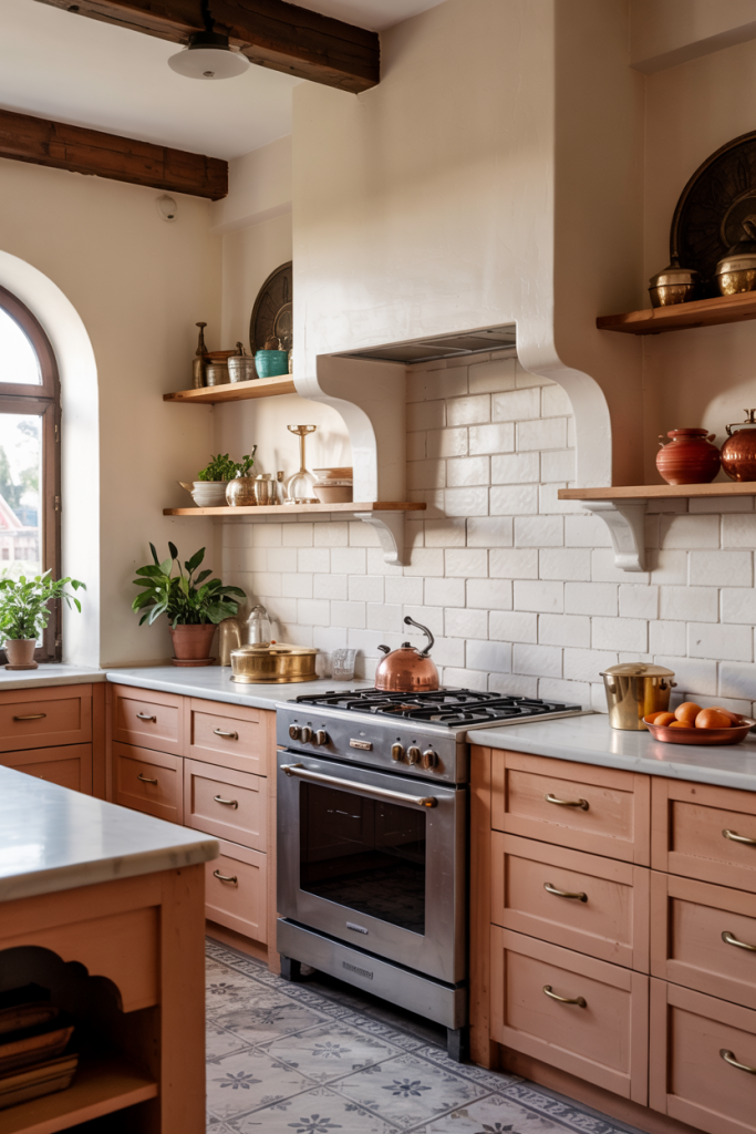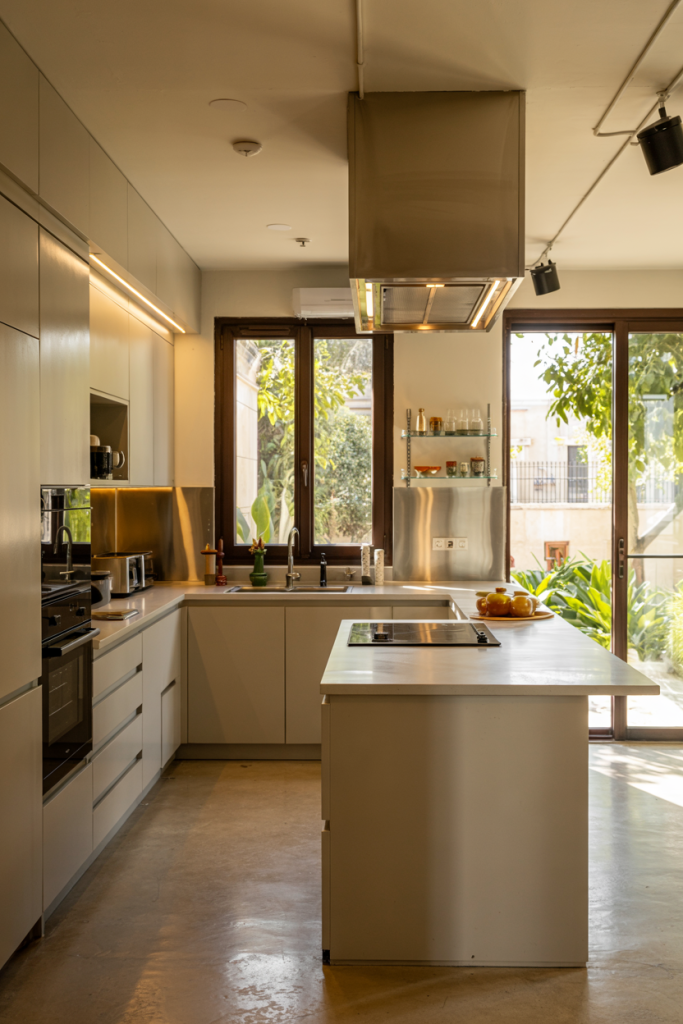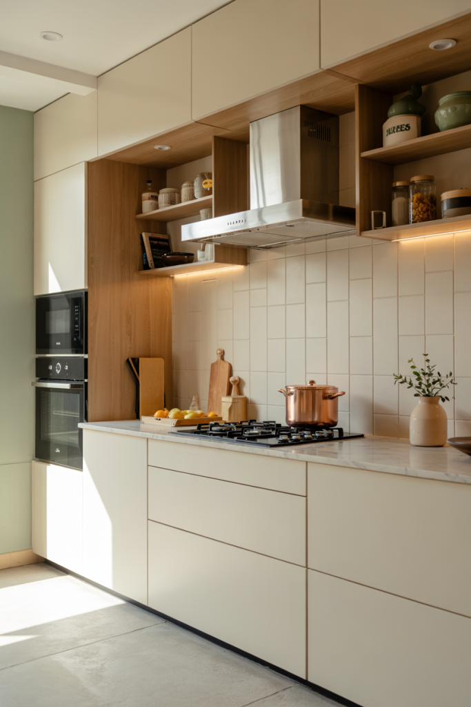 Open kitchens with an Indian twist balance functionality with tradition. Brass handles and sleek quartz surfaces blend here, and terracotta hues add warm comfort. Clean surfaces, natural air flow, and bright accessories — all this carries on the easy Indian ethos and turns cooking into a sensory treat.